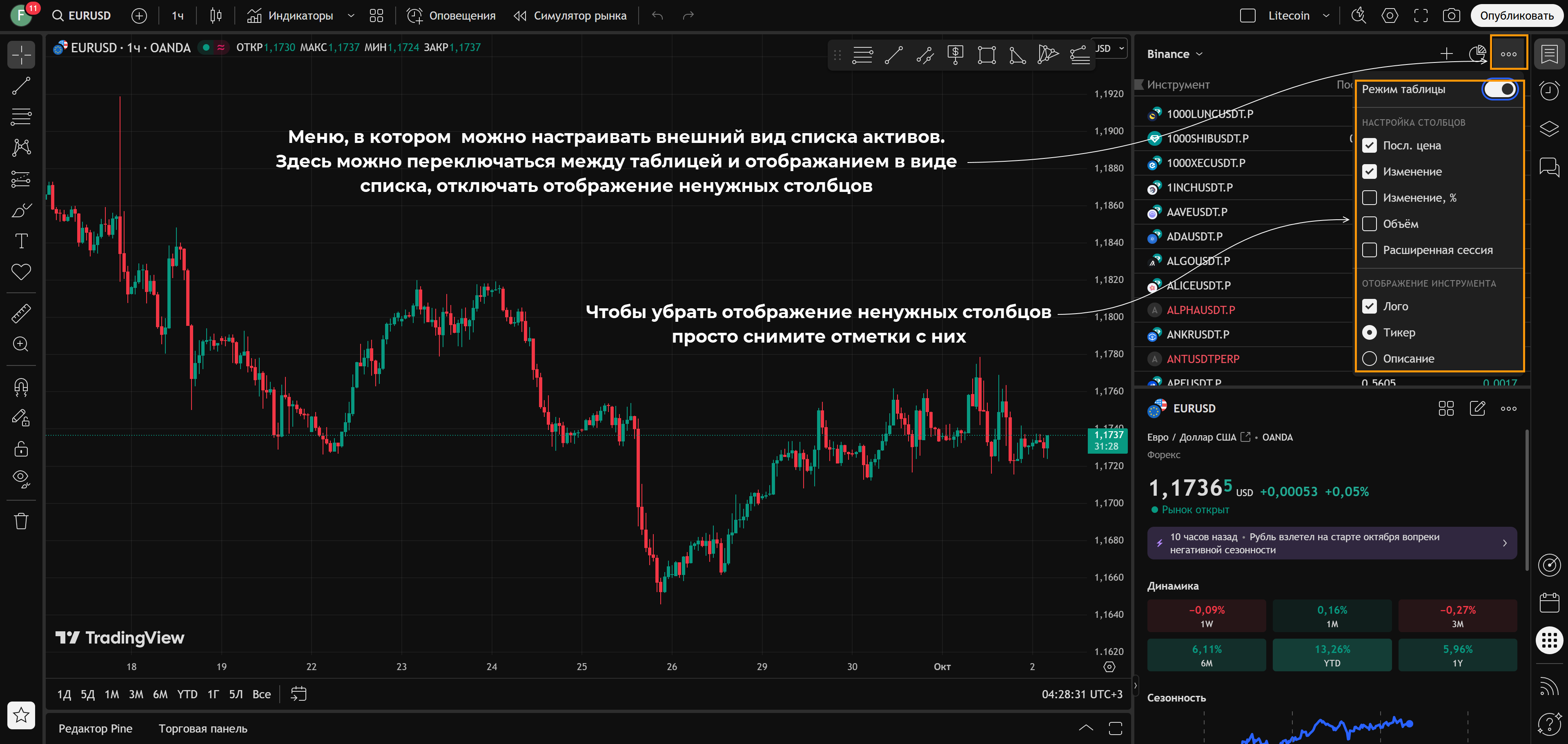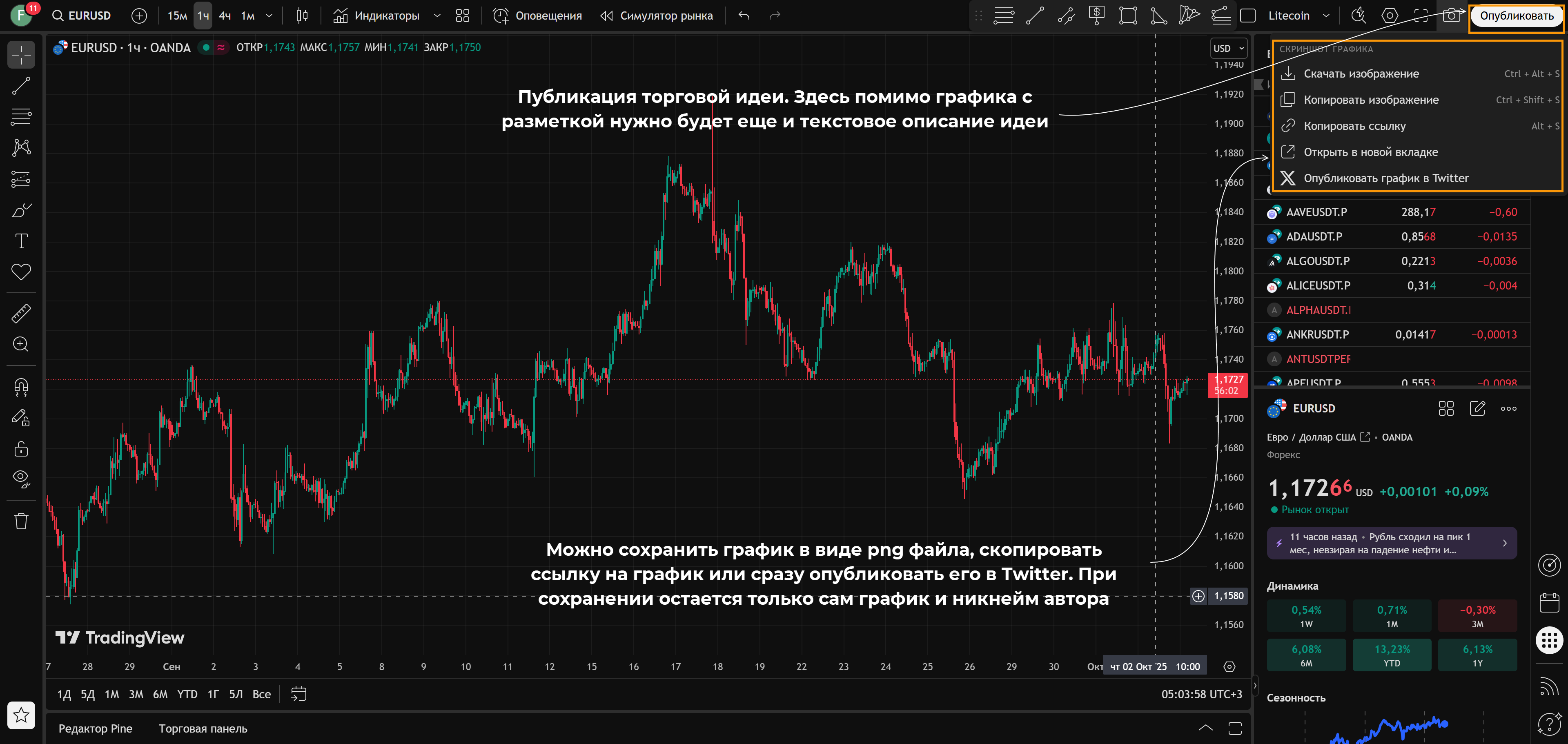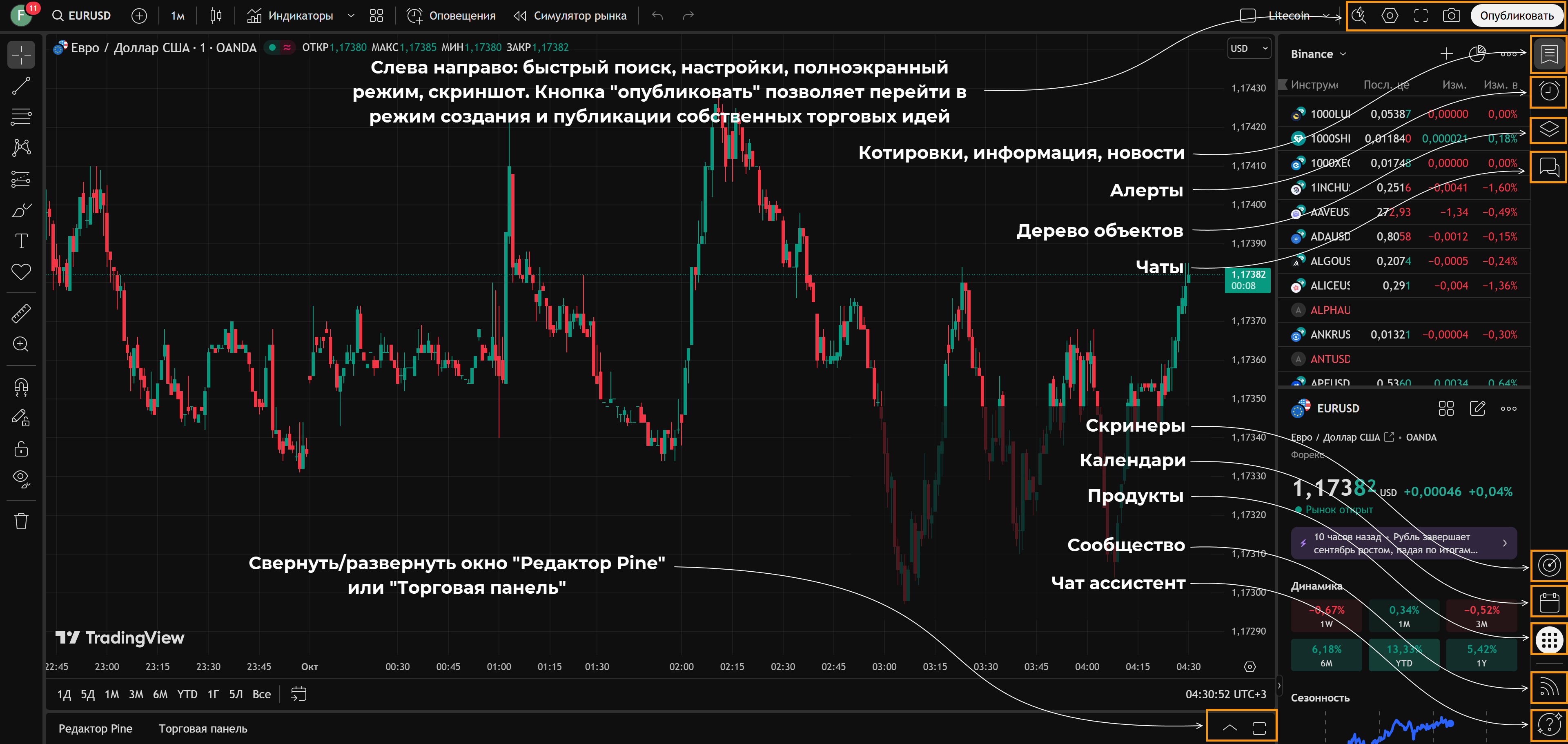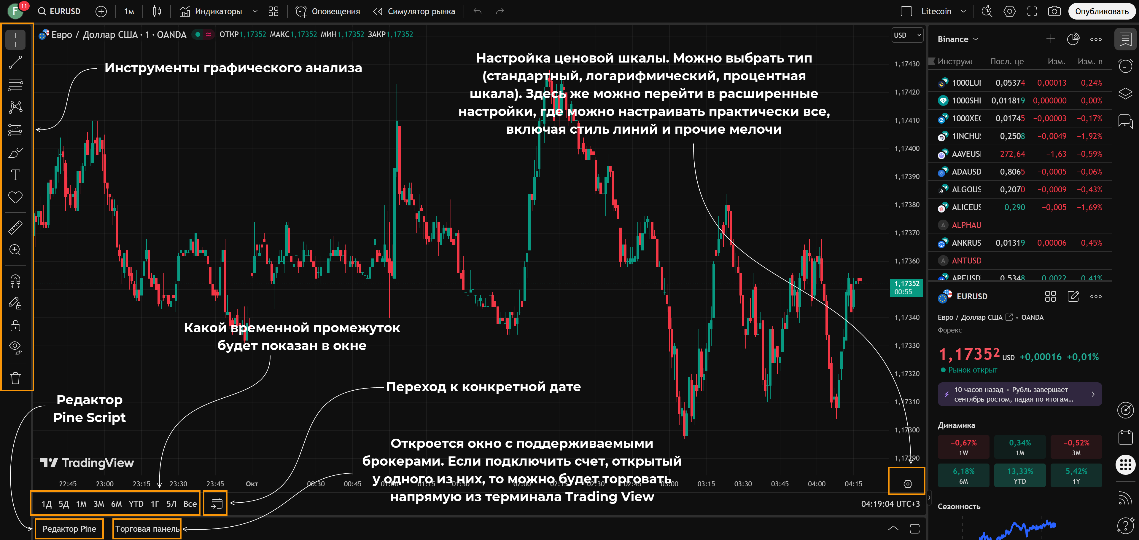 Ниже – небольшое пояснение как пользоваться TradingView, своего рода мини-инструкция: