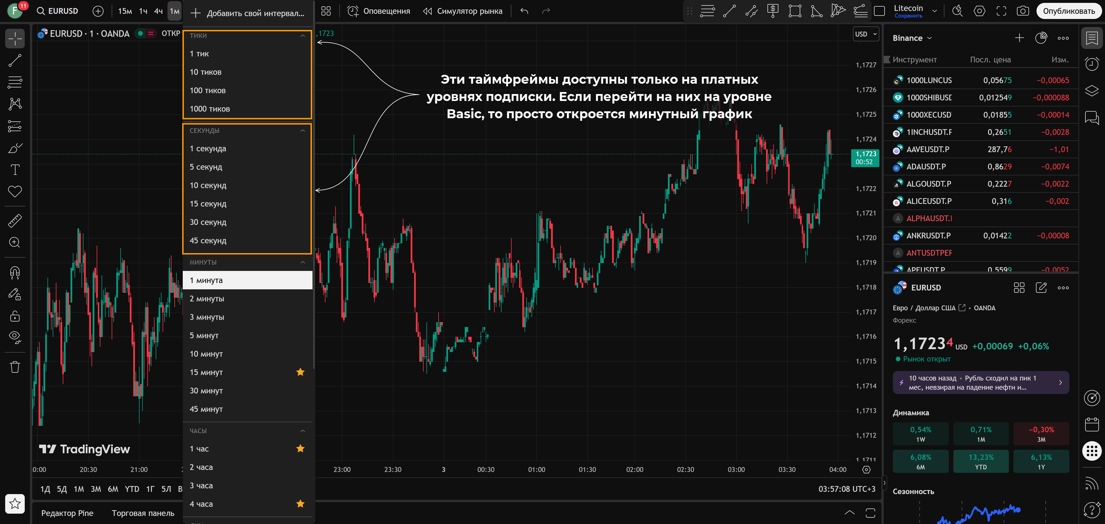 • Ограничения бесплатного плана: реклама, всего 1 чарт на вкладку, 2 индикатора на чарт, ограниченные алерты