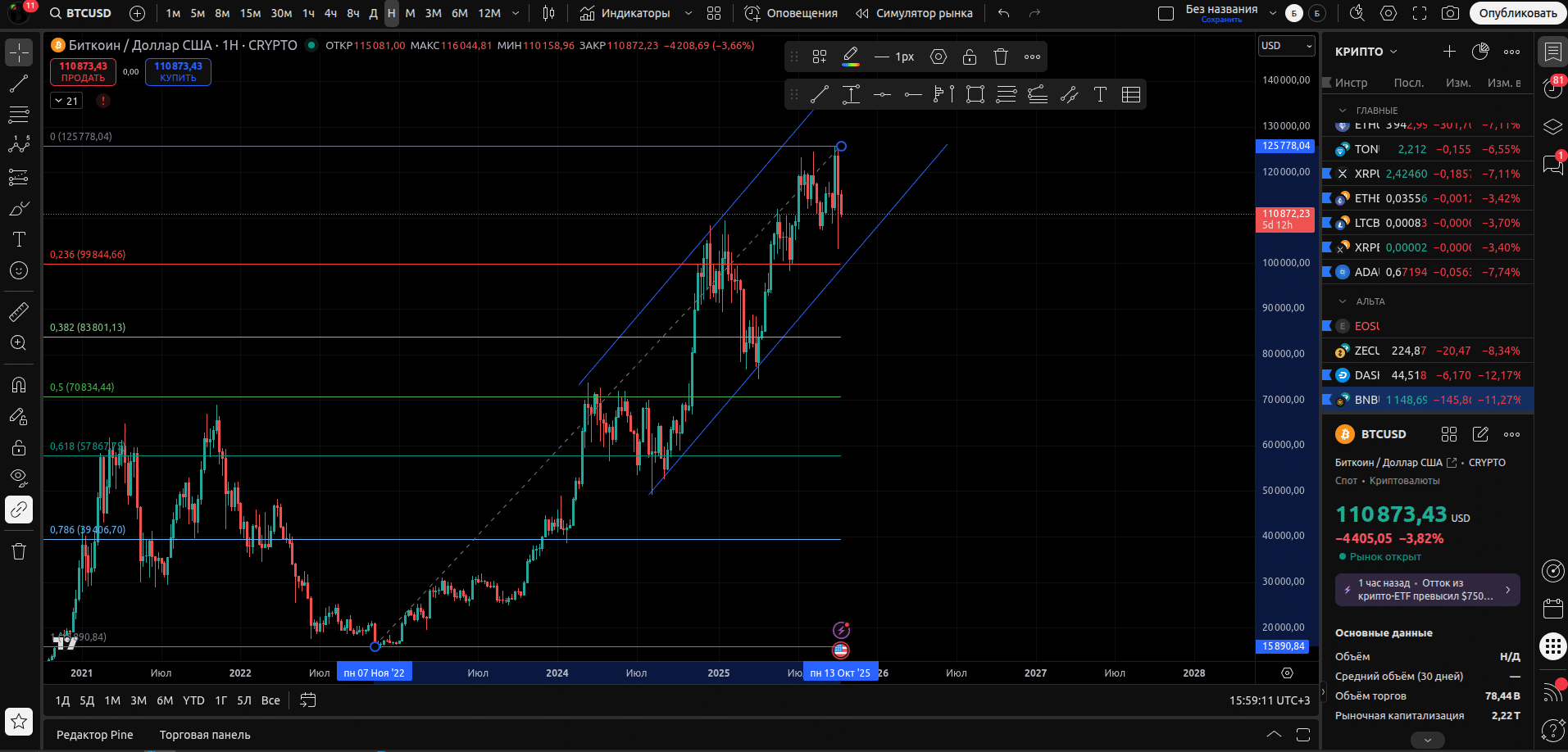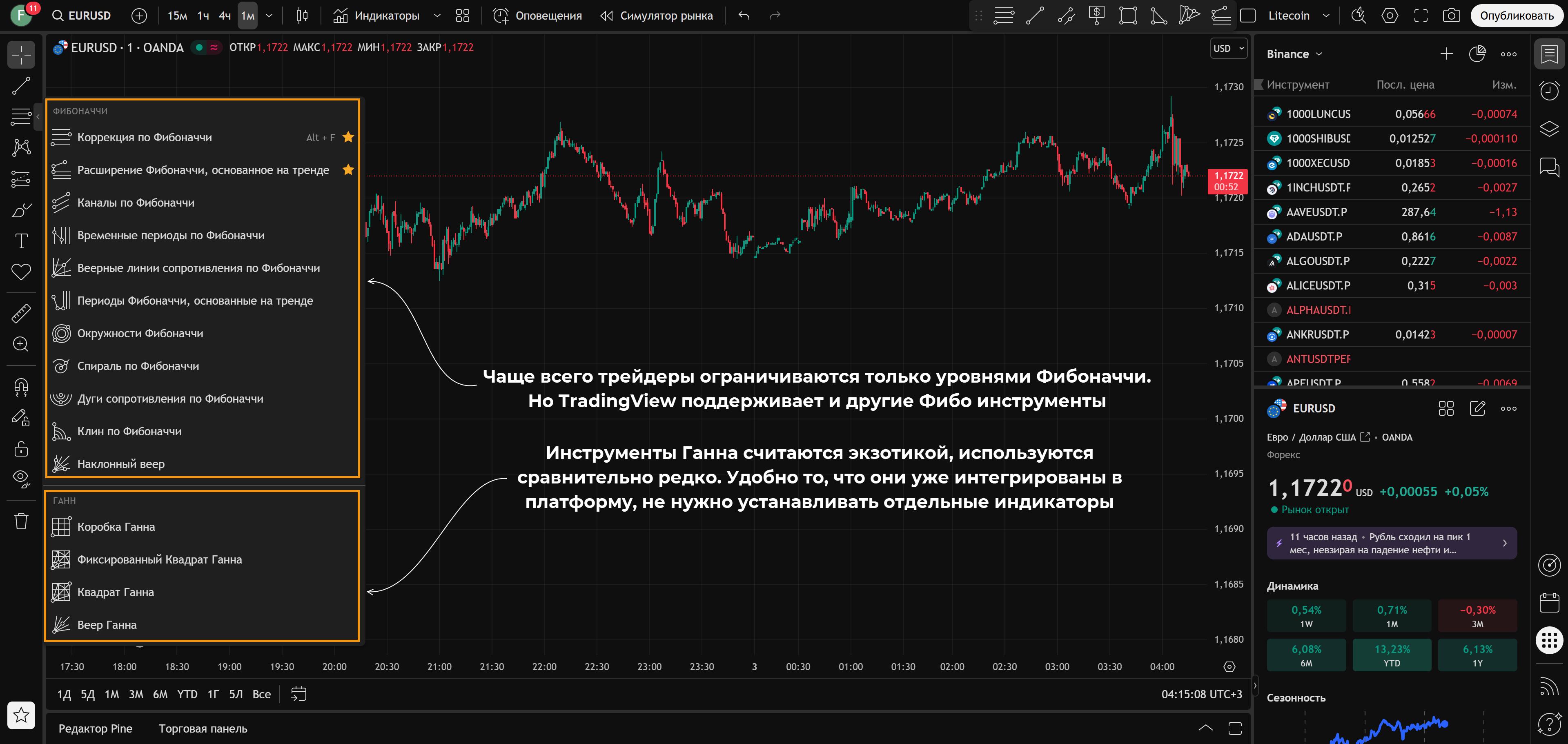 • В левом вертикальном меню – инструменты для графического анализа. Доступны в том числе не самые популярные спираль Фибоначчи, квадрат Ганна.