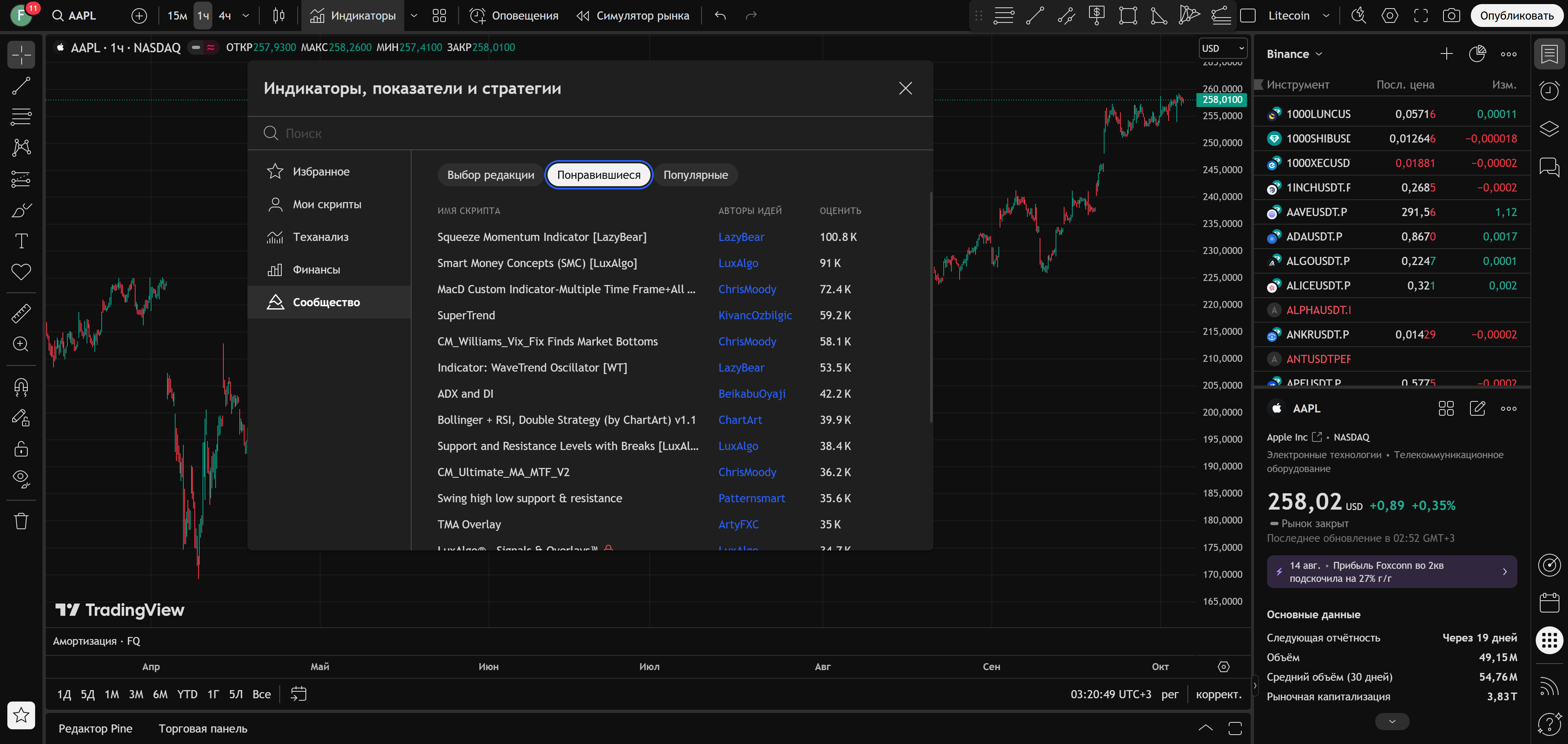• Открытость данных. В отличие от многих платформ, TradingView предоставляет данные с большинства мировых бирж: NYSE, NASDAQ, LSE, Euronext, Московская биржа, криптобиржи Binance, Coinbase, и многие другие. Хотите сравнить акции Apple с золотом и Bitcoin одновременно? Пожалуйста.