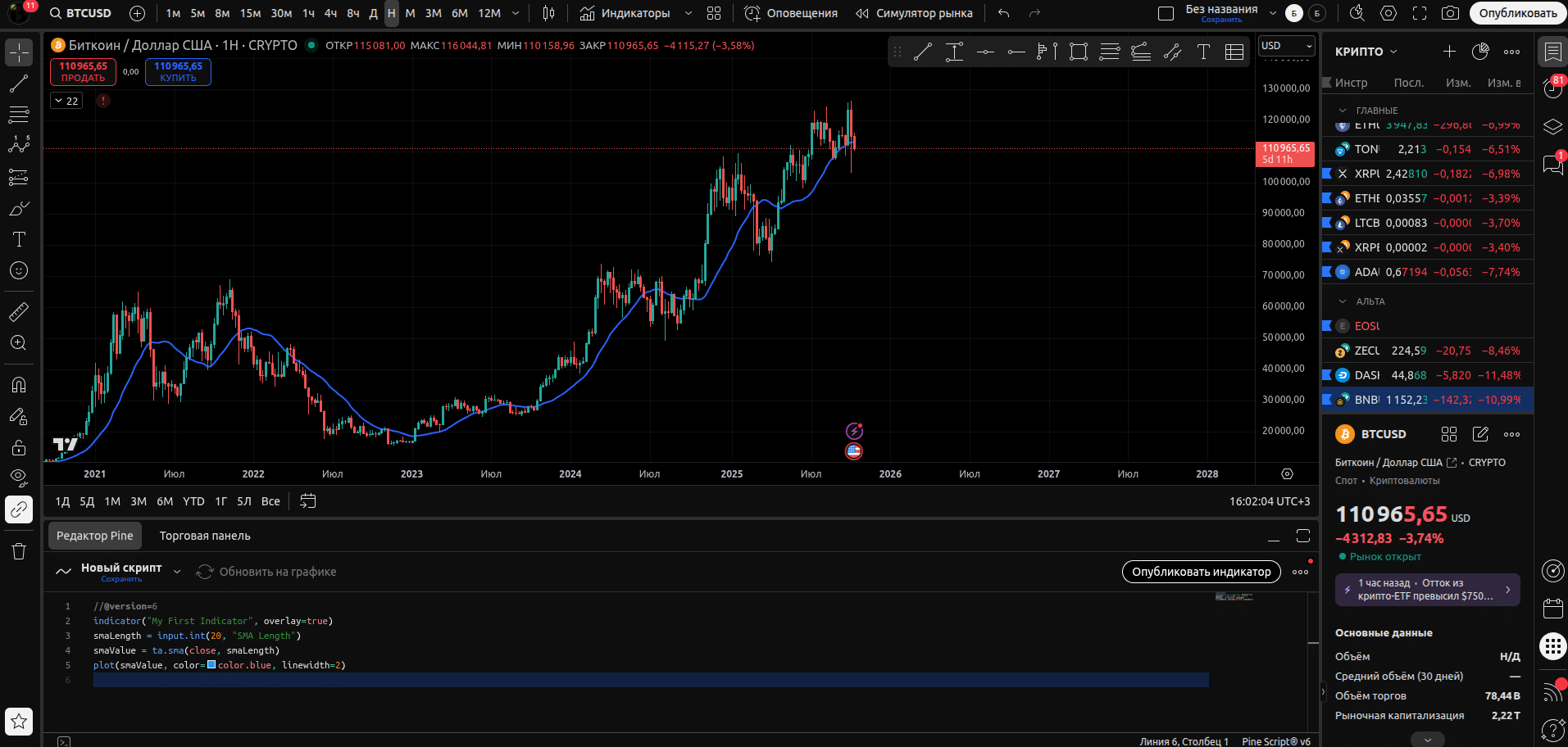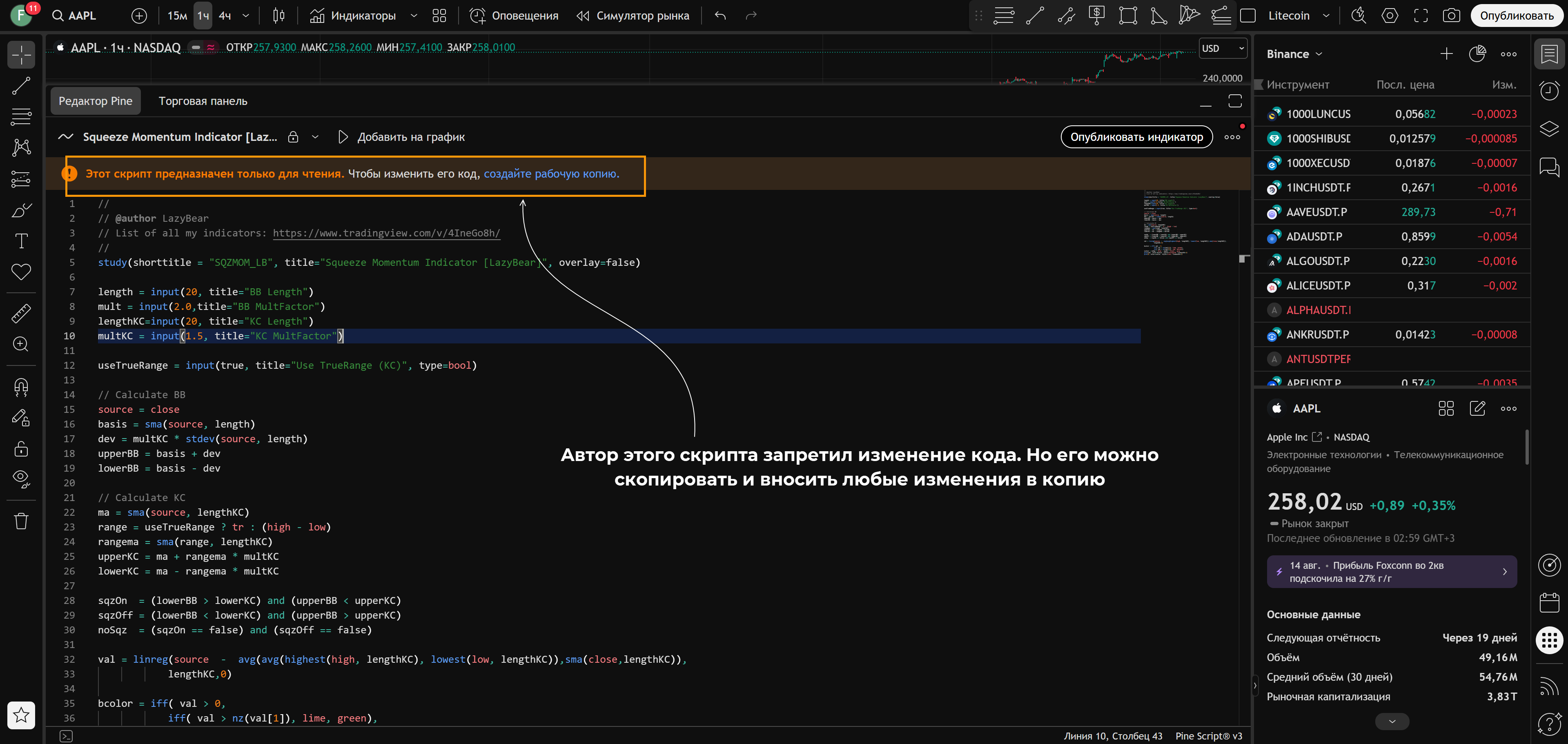 • Здесь же, под кнопками для переключения глубины истории, есть ссылки на редактор Pine и Торговую панель. Редактор открывает окно, в котором можно ознакомиться с кодом индикатора/стратегии или написать собственный индикатор.