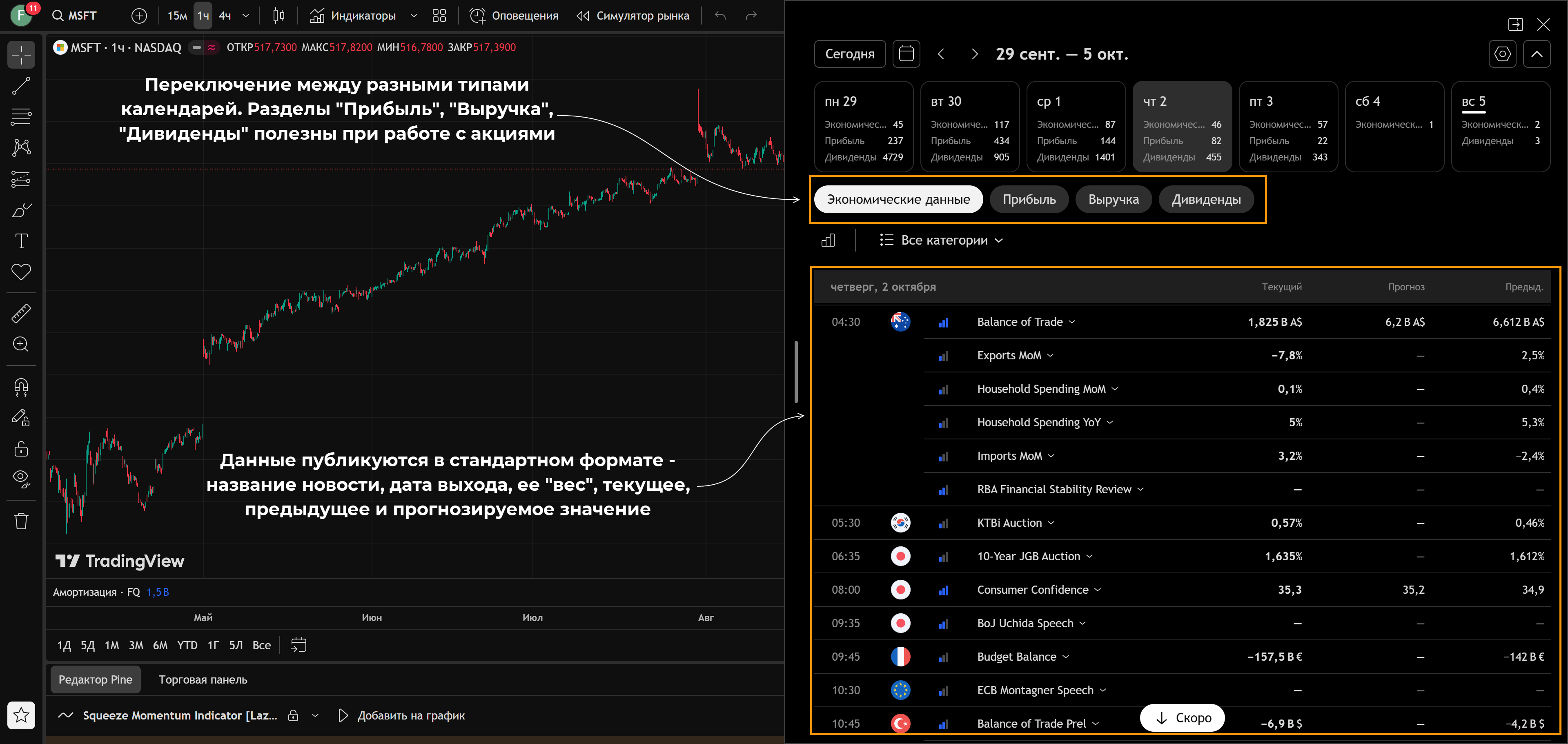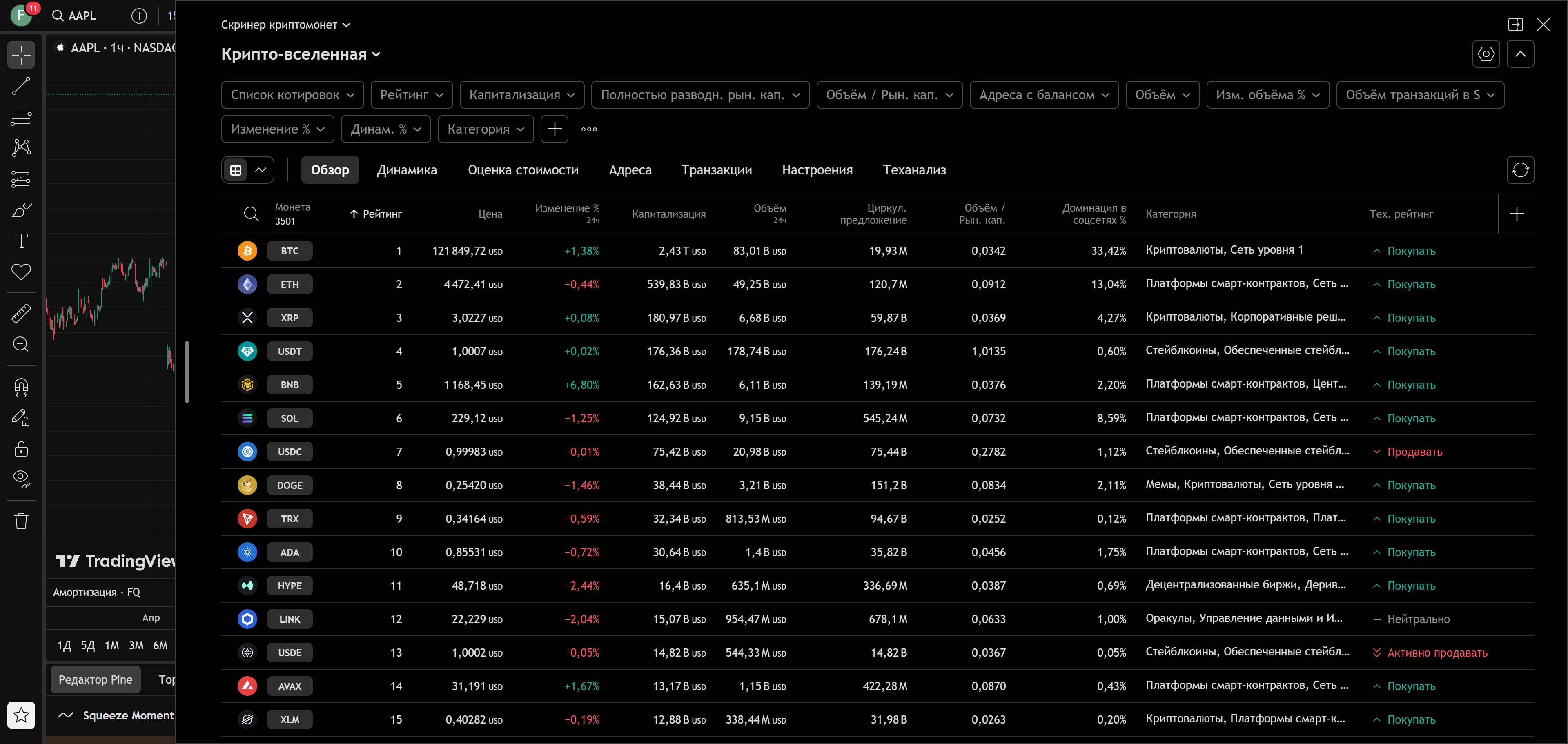 • Есть встроенные скринеры (фондовый рынок, криптовалюты).