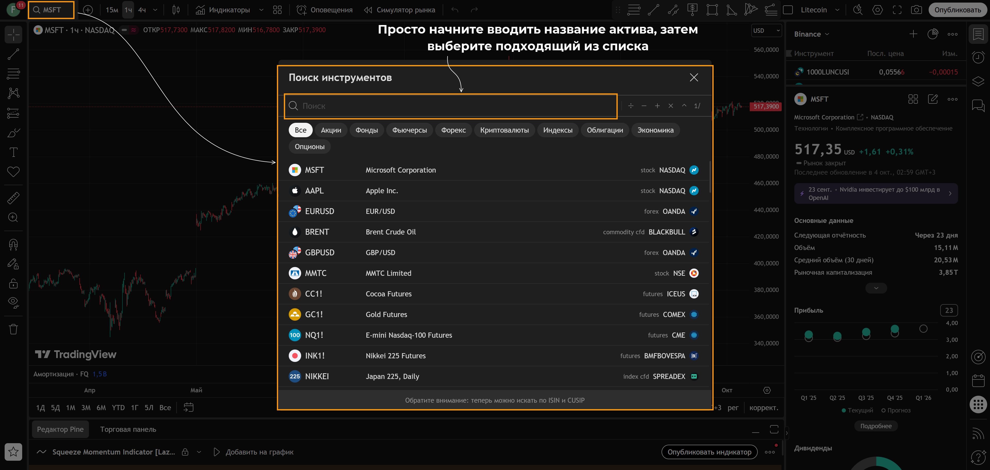 • Добавьте график нужного актива. В левом верхнем углу – кнопка для выбора инструмента. После ее нажатия появится окно, в поисковой строке введите название актива, выберите подходящий вариант.