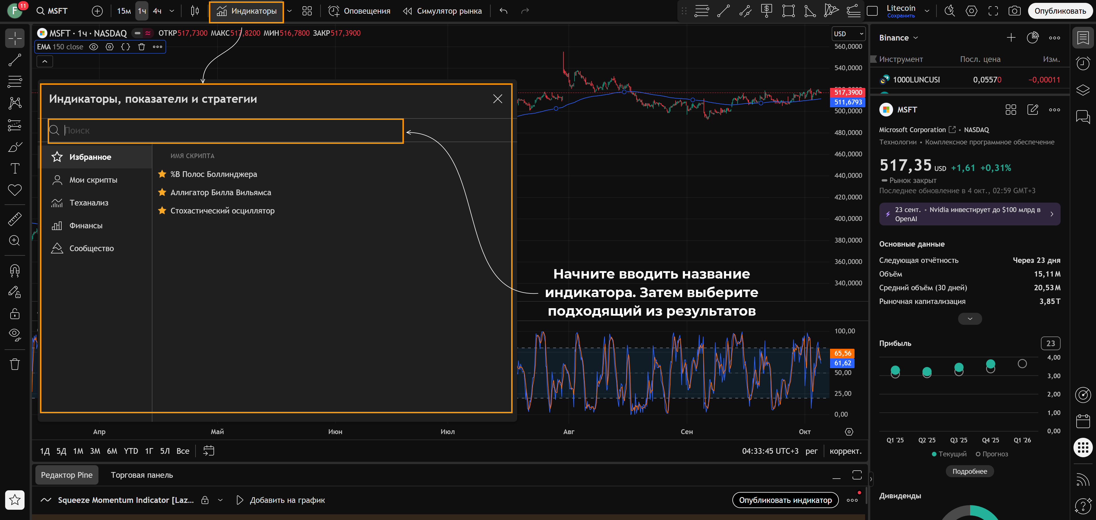 • Добавьте индикатор/индикаторы. В примере добавлены Стохастик и скользящая средняя.