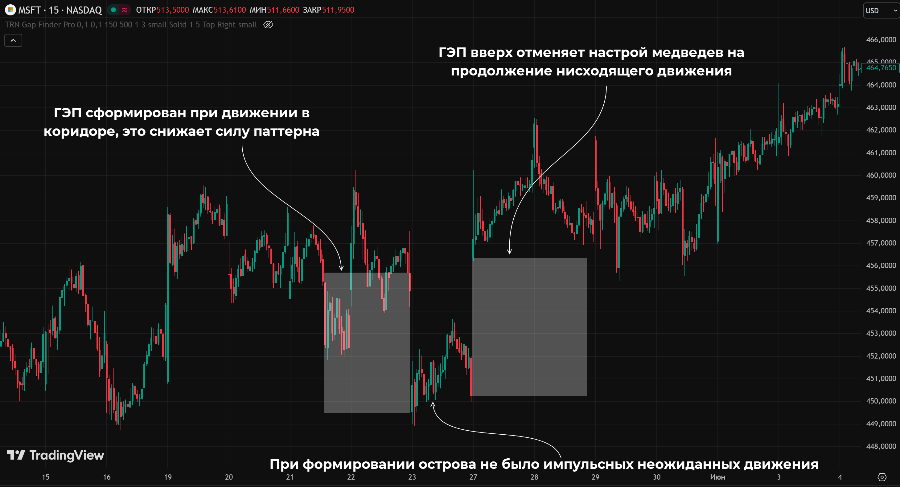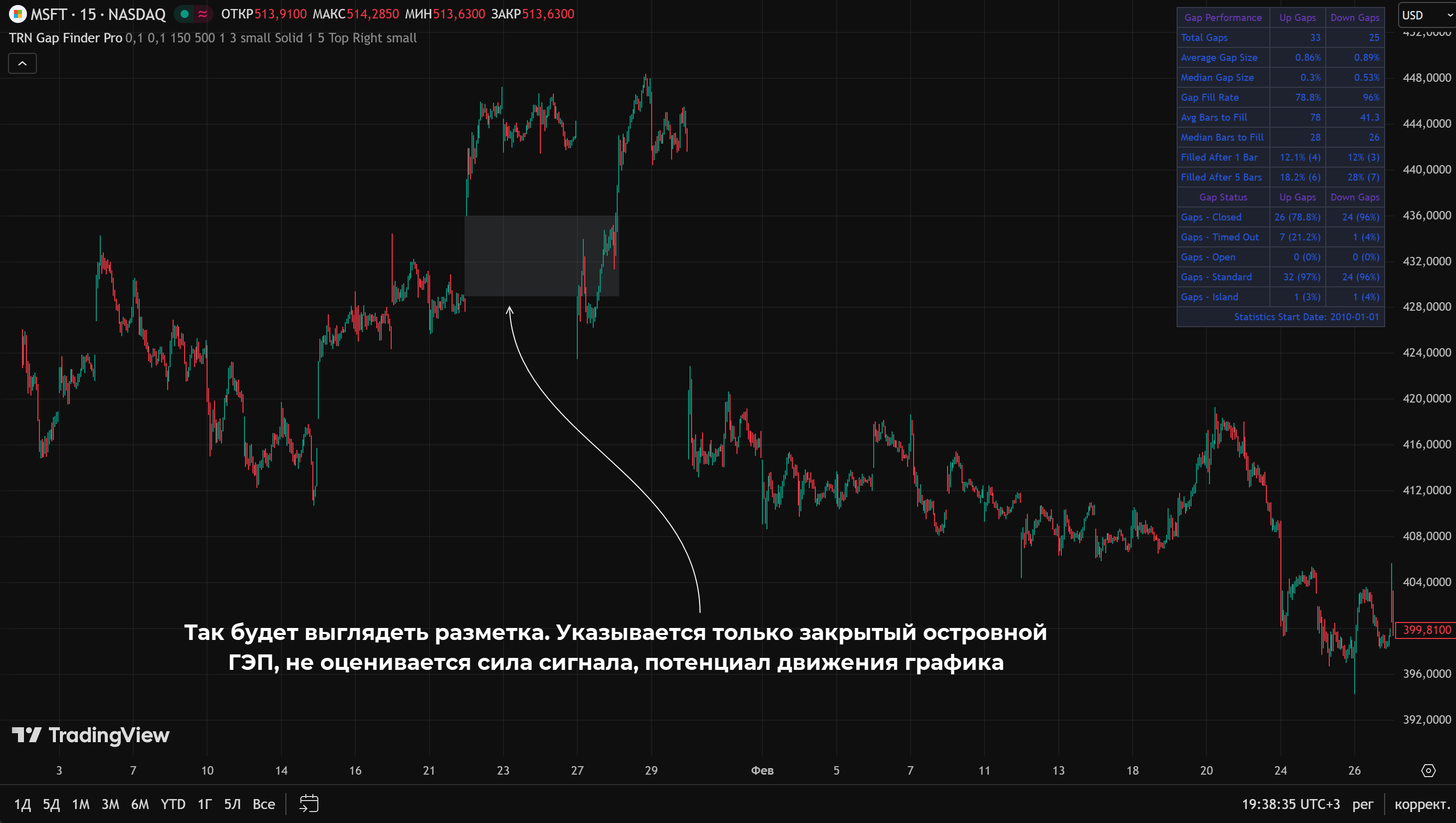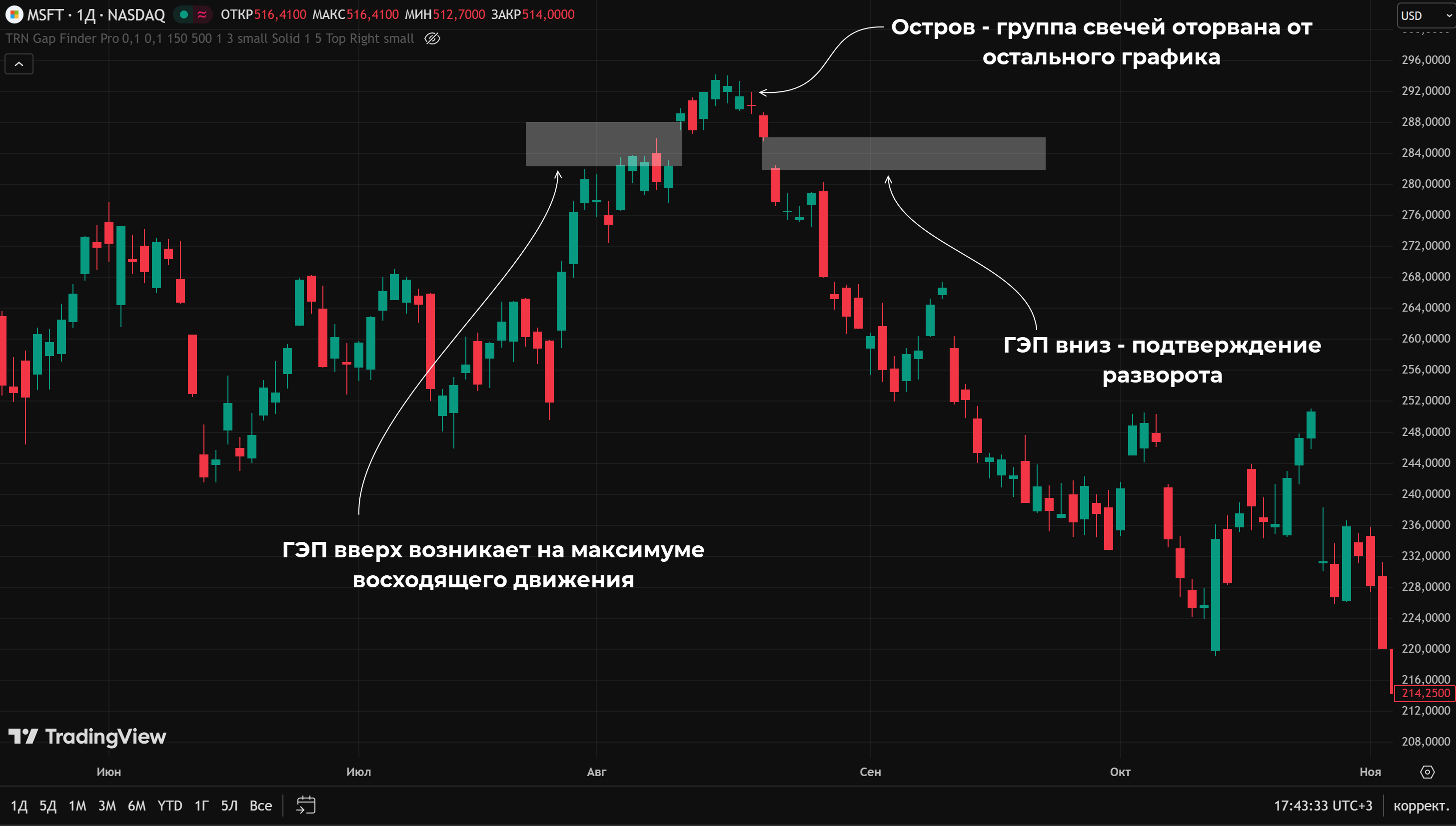 Можно использовать индикатор для поиска ГЭПов, у некоторых из них есть встроенный «островной» функционал. Так, на TradingView доступен бесплатный индикатор TRN Gap Finder Pro, он умеет работать как с обычными, так и с островными разрывами.