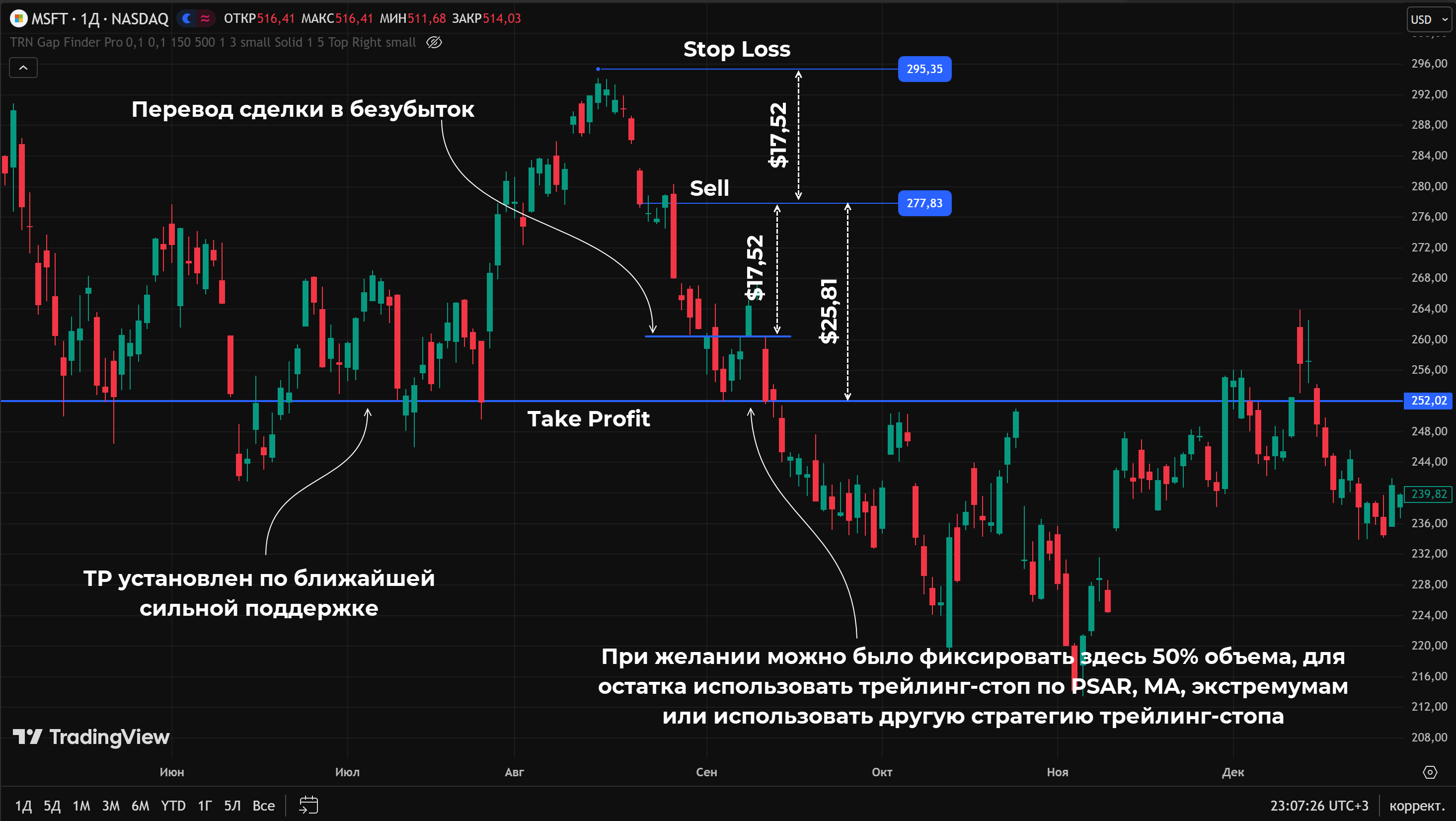 Если позволяет объем сделки, и вы уверены в потенциале движения, то на ближайшем уровне можно фиксировать половину объема. Часть позиции остается в рынке, для этого объема можно использовать трейлинг-стоп, чтобы выжать максимум из возможного роста/падения.