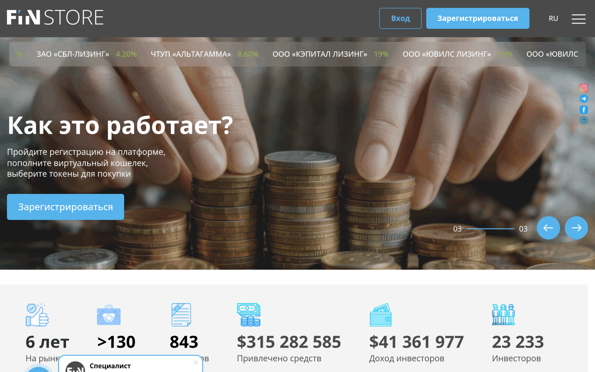 Finstore работает с 2019 года, оператор — ООО «ДФС», резидент Парка высоких технологий, деятельность регулируется Декретом № 8. По данным самой площадки на начало 2026 года: около 23 200 инвесторов, более 130 активных эмитентов, свыше 843 выпусков токенов на общую сумму около 315 млн USD, выплаченный инвесторам доход — около 41 млн USD.