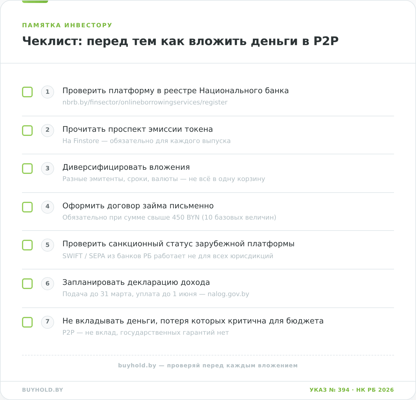 Что это значит для инвестора: перед тем как передавать кому-либо деньги через площадку, называющую себя «p2p-сервисом», обязательно проверьте её в реестре НБРБ (nbrb.by/finsector/onlineborrowingservices/register). Если оператора в реестре нет — это либо нелегальная деятельность, либо просто «объявления о займах», за которыми никто из регуляторов не стоит и куда возвращать деньги через суд будет заметно сложнее.