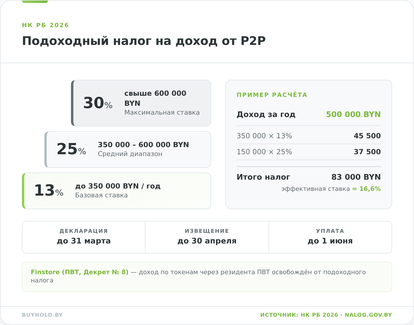 Отдельно по Finstore.by: платформа работает в периметре Декрета № 8 «О развитии цифровой экономики», оператор — резидент ПВТ, и доход физлица по цифровым токенам, полученный через резидента ПВТ, освобождён от подоходного налога. Это ключевое налоговое преимущество Finstore перед большинством других инвестиционных инструментов.