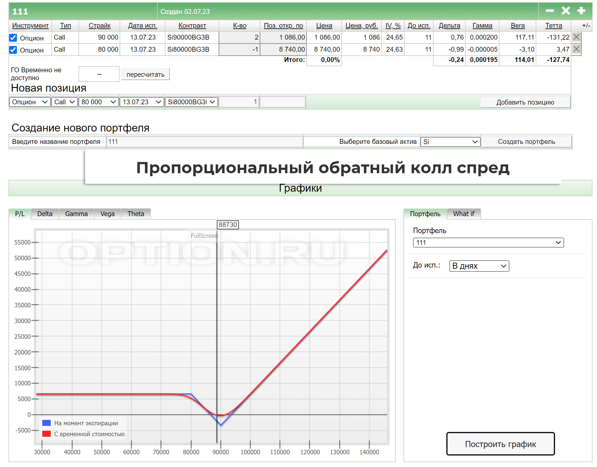 - Пропорциональный обратный call spread. Покупается 2 опциона Колл с более высоким страйком и продается один опцион Колл с низким страйком. Поэтому колл спред и называется обратнопропорциональным – ставка делается на более высокую вероятность роста актива.