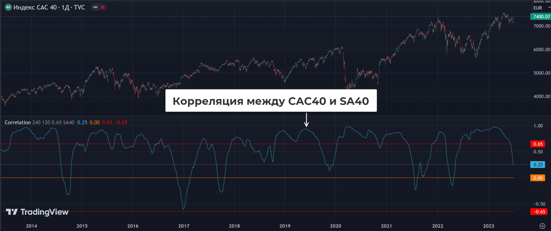 Если сравнить те же активы (CAC40 и SA40) с точки зрения корреляции, то окажется, что она, мягко говоря, неидеальна. Иногда доходит почти до 1,0, но затем может упасть ниже нулевой отметки.