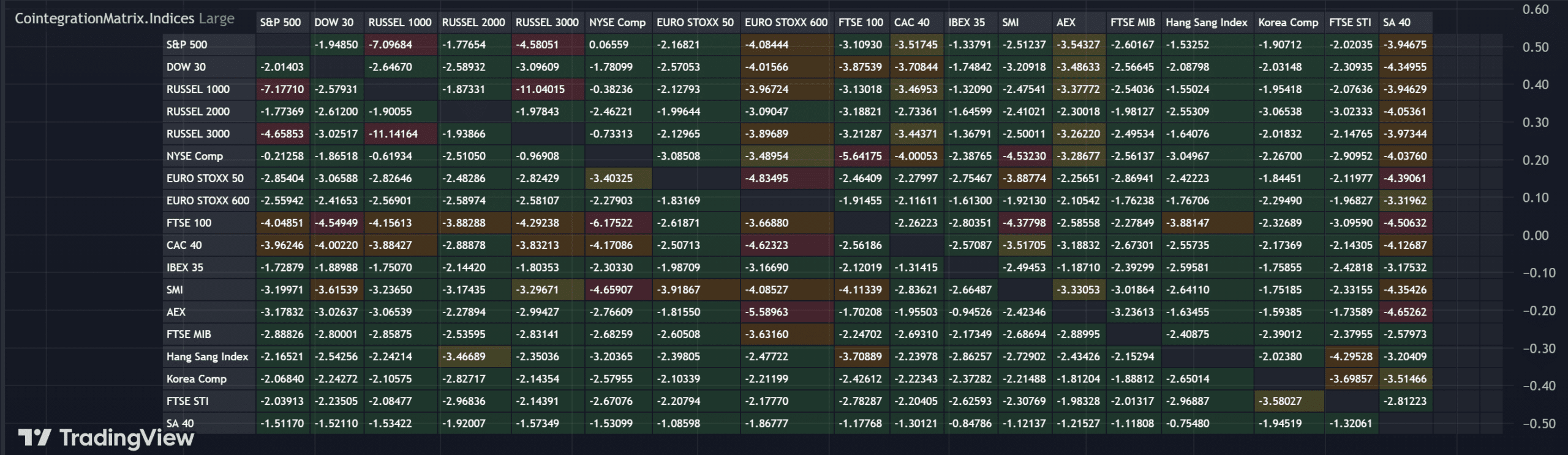 Не существует индикаторов, которые можно было бы использовать для расчета коинтеграции любых активов. Но в TradingView есть несколько индикаторов, выдающих данные по набору индексов и валютных пар. Их можно использовать для тренировки и отбора хотя бы нескольких пар, подходящих для парного трейдинга.