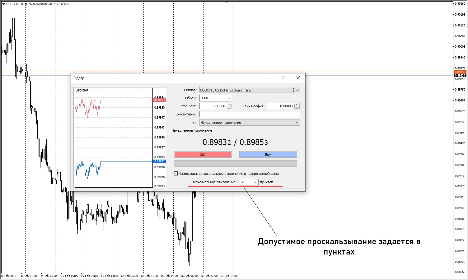 Еще один нюанс – фильтр по проскальзыванию. В МетаТрейдере поле «Максимальное отклонение» работает так же, как трейлинг-стоп: значение задается в пипсах (минимальных единицах терминала). Если стратегия допускает проскальзывание в 3 пункта, то на 5-разрядных котировках в этом поле нужно указать 30 (потому что 3 пункта = 30 пипсов). Если по ошибке задать 3, терминал будет допускать отклонение лишь в 3 пипса – это приведет к частым реквотам.