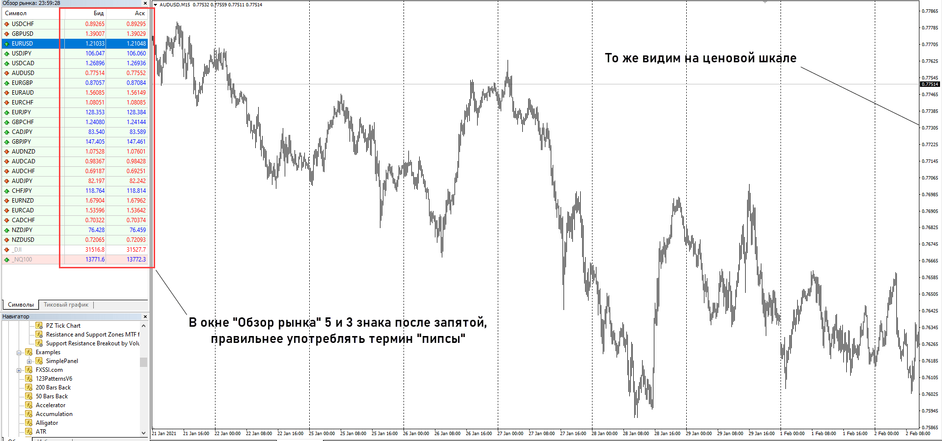 Чтобы узнать разрядность котировок достаточно посмотреть на окно «Обзор рынка» или на правую часть рабочего пространства, где отображается ценовая шкала. Если после запятой 5 или 3 знака, значит нужно применять термин pips (пипс), если 4 или 2 – point (пункт).
