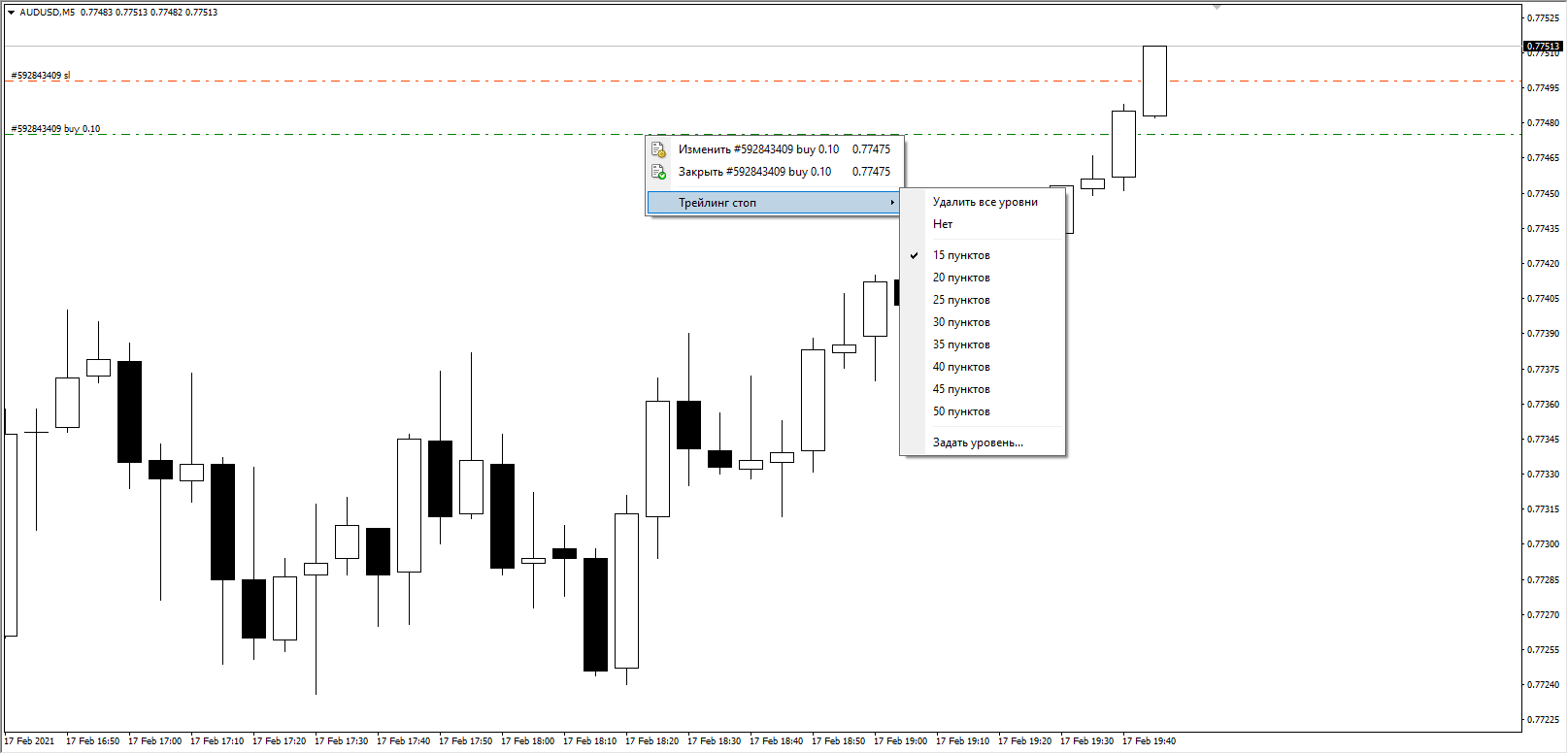 Обратите внимание на рисунок ниже. Установлен минимально допустимый трейлинг-стоп в 15 пунктов, при этом фактически стоп движется вслед за ценой с шагом в 15 пипсов.