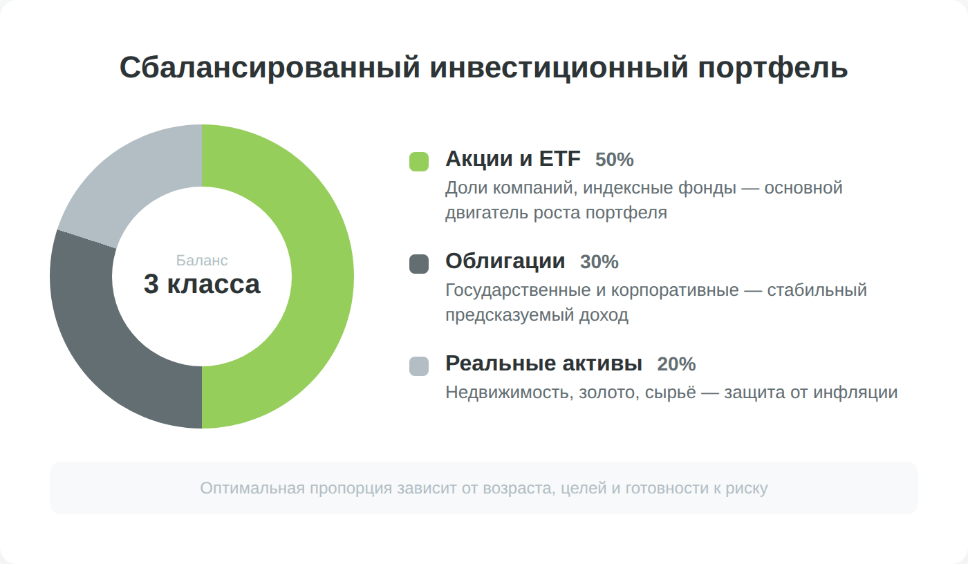 Базовый вариант диверсификации — иметь в портфеле три основных класса активов: