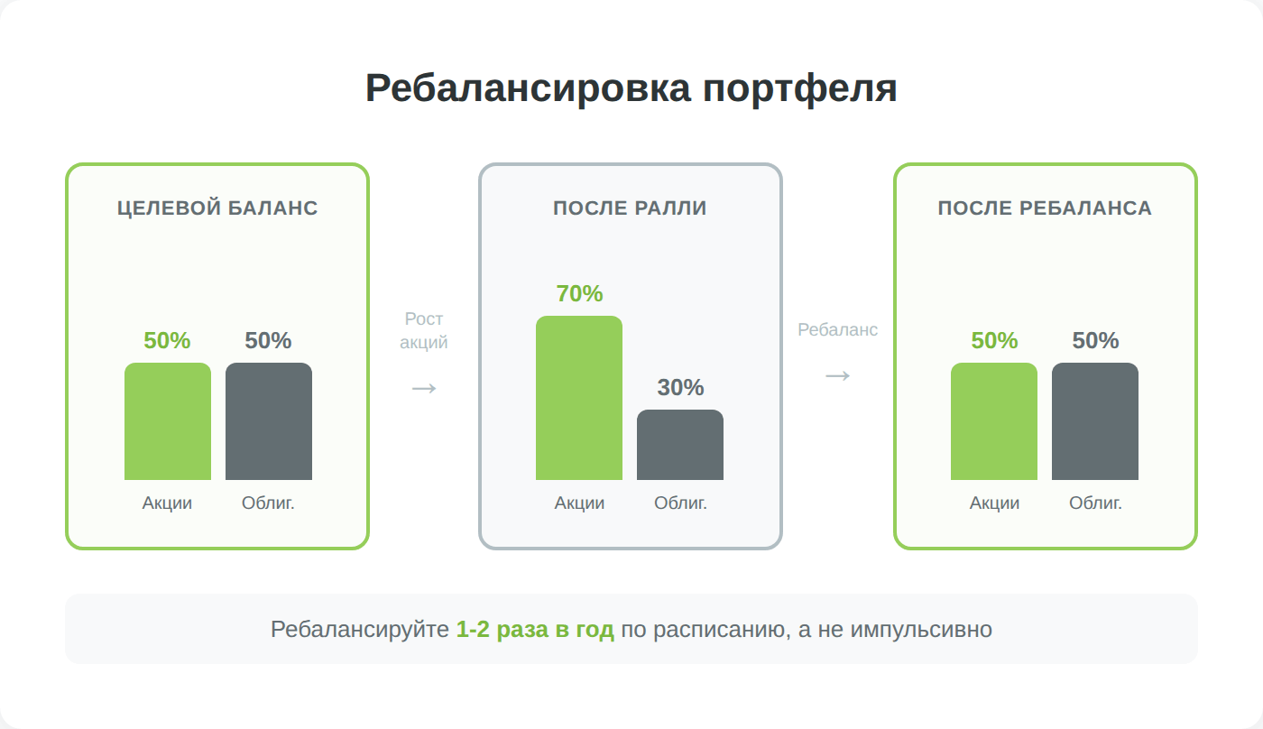 Диверсификация — это только первый шаг к сбалансированному портфелю. Дальше его нужно периодически ребалансировать, то есть возвращать к целевым пропорциям активов. Со временем более доходные инструменты перевешивают в структуре портфеля, и баланс рисков нарушается.