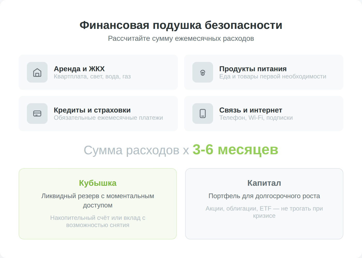 Распространенная рекомендация — держать на банковских счетах сумму, равную 3-6 месячным расходам. Чтобы подсчитать эту сумму, учтите:
