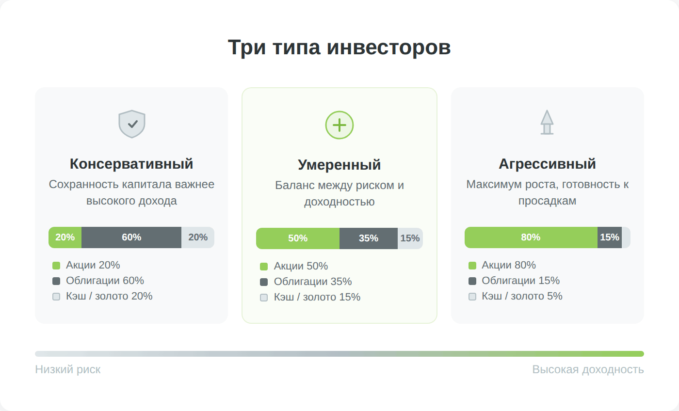 От риск-профиля зависит, какую долю портфеля вы будете держать в рискованных (акции) и надежных (облигации, депозиты) активах. Важно учесть и свой возраст: чем ближе к пенсии, тем больше денег стоит перекладывать в защитные инструменты.