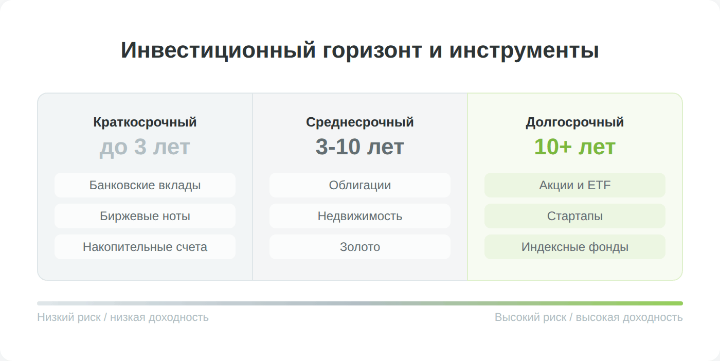 - Для долгосрочных вложений от 10 лет подойдут более рискованные и потенциально доходные инструменты: акции, ETF, стартапы.