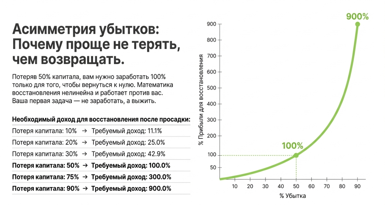 Приведённые расчёты показывают ещё одну критически важную закономерность: чем глубже просадка, тем сложнее из неё выбраться. При потере 10% капитала достаточно заработать 11,1% для возврата к начальному уровню. Но при потере 50% нужен уже прирост в 100%, а потеря 90% требует фантастического дохода в 900% для восстановления.