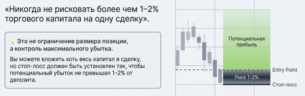 Правило 1–2% — это принцип управления рисками, согласно которому трейдер никогда не должен рисковать более чем 1–2% от своего торгового капитала на одну сделку.