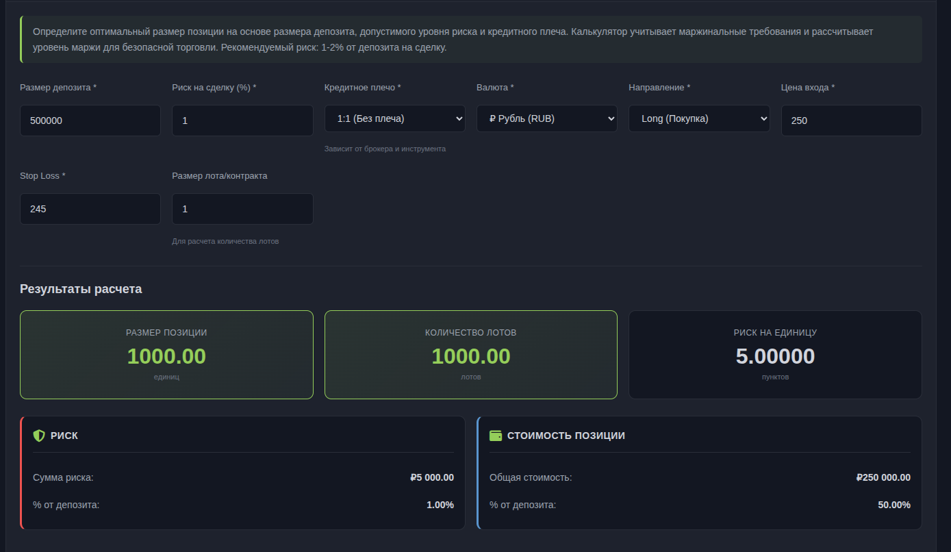 Полная стоимость позиции в этом случае составит 250 000 рублей (1000 акций × 250 рублей), что равно 50% вашего депозита. Многие новички в этот момент пугаются: «Как так, я ведь вкладываю половину денег в одну сделку!» Но помните — вы рискуете не 50%, а лишь 2%. В худшем случае, если стоп-лосс сработает, вы потеряете только 10 000 рублей, а не 250 000.