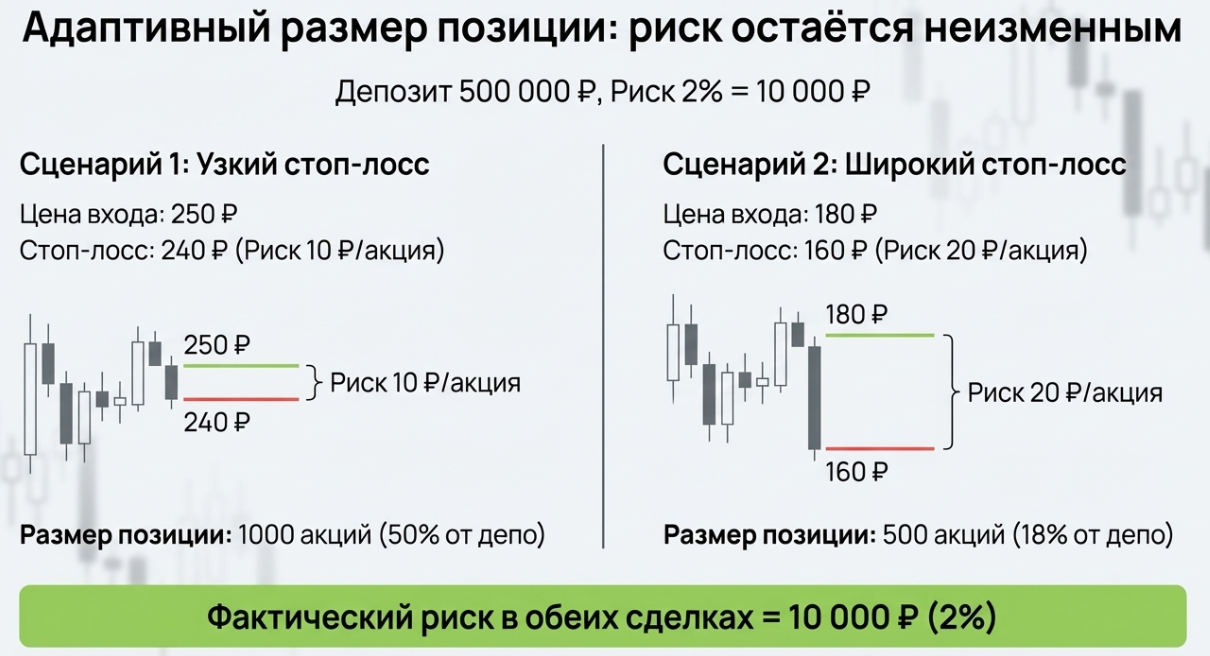 Заметьте, как размер позиции автоматически адаптируется к ширине стоп-лосса, обеспечивая одинаковый уровень риска в обоих случаях.