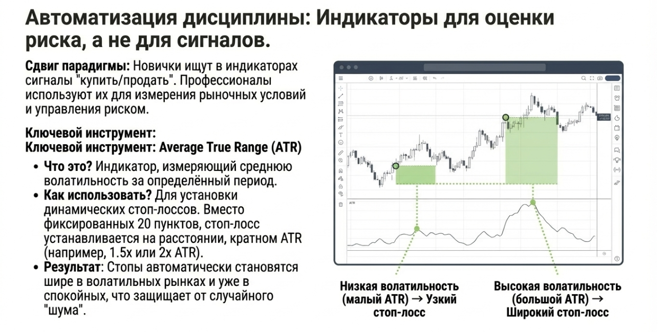 Система «Черепах» использовала индикатор ATR (Average True Range) — средний истинный диапазон — для динамической корректировки размера позиции. Идея проста: в периоды высокой волатильности позиция уменьшается, в периоды низкой — увеличивается. Это позволяет поддерживать относительно стабильный долларовый риск независимо от «поведения» рынка.