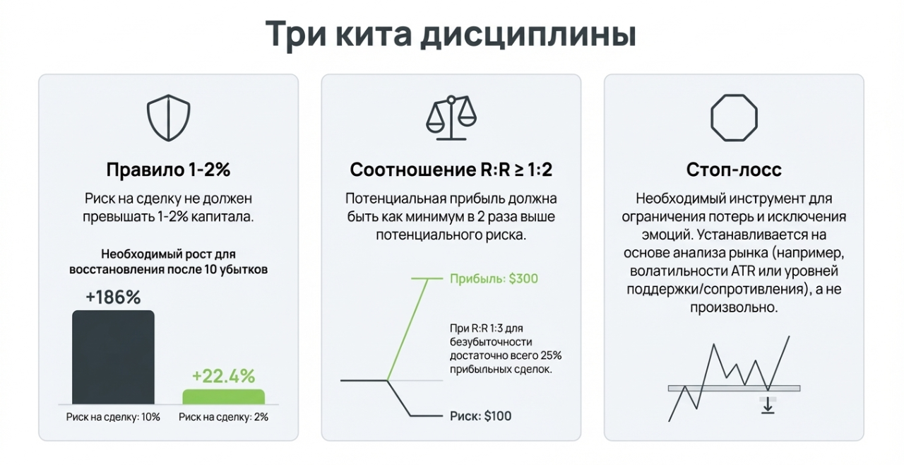 Минимальный R:R 1:2 минимум, оптимально 1:3 и выше