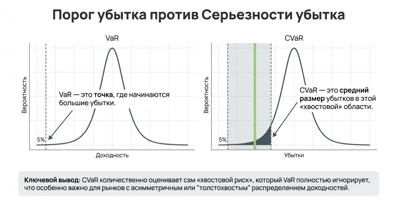 Conditional VaR (CVaR), также известный как Expected Shortfall, решает главную проблему обычного VaR. Эта метрика показывает средний размер убытка в худших сценариях — тех самых 5% (или 1%), которые VaR игнорирует. Если VaR отвечает на вопрос «Какой максимальный убыток при нормальных условиях?», то CVaR отвечает на вопрос «А что если условия окажутся ненормальными?».