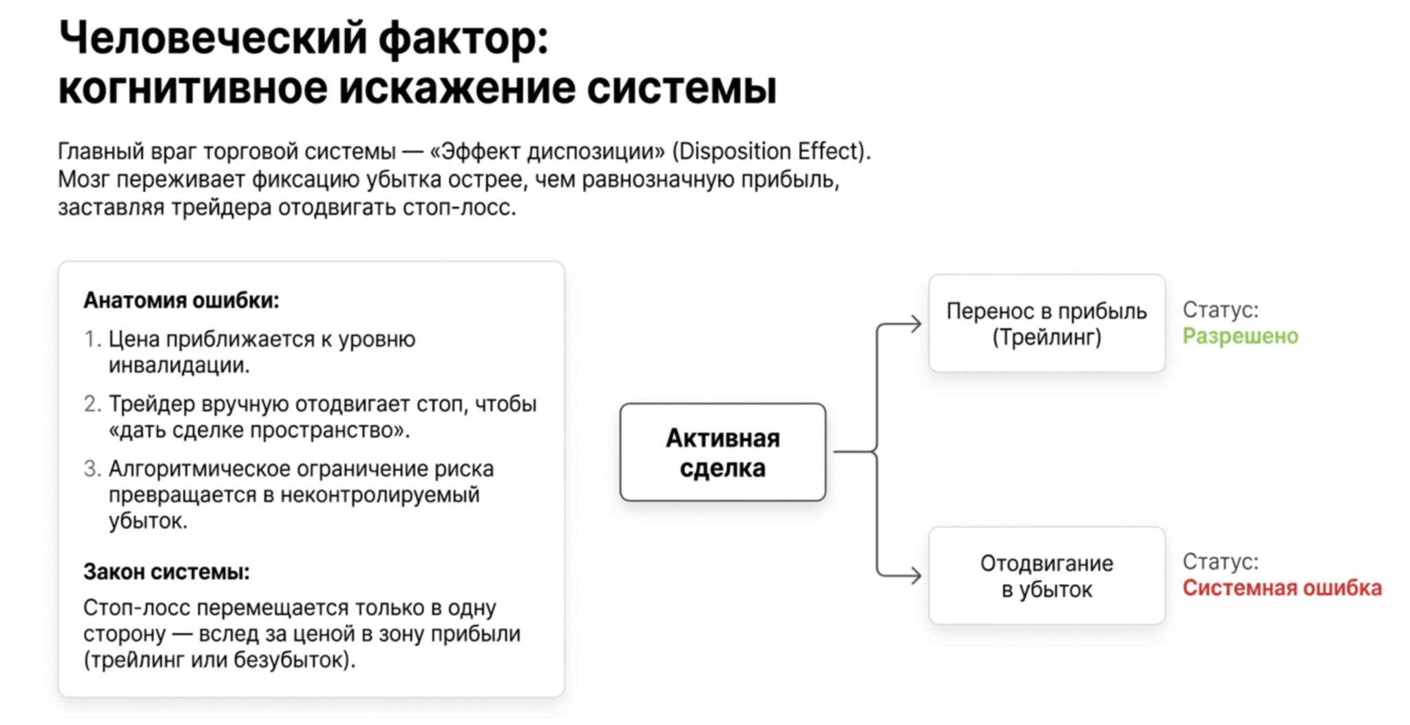 Психологи называют это «эффектом диспозиции» (disposition effect) — задокументированная поведенческая аномалия, при которой инвесторы склонны слишком долго держать убыточные позиции и слишком рано закрывать прибыльные. Получить маленький убыток, зафиксировав стоп — это «боль потери», которую мозг переживает острее, чем равнозначную прибыль. Поэтому мозг придумывает рационализации: «Цена вернётся», «Это временная коррекция», «Стоп стоит слишком близко».