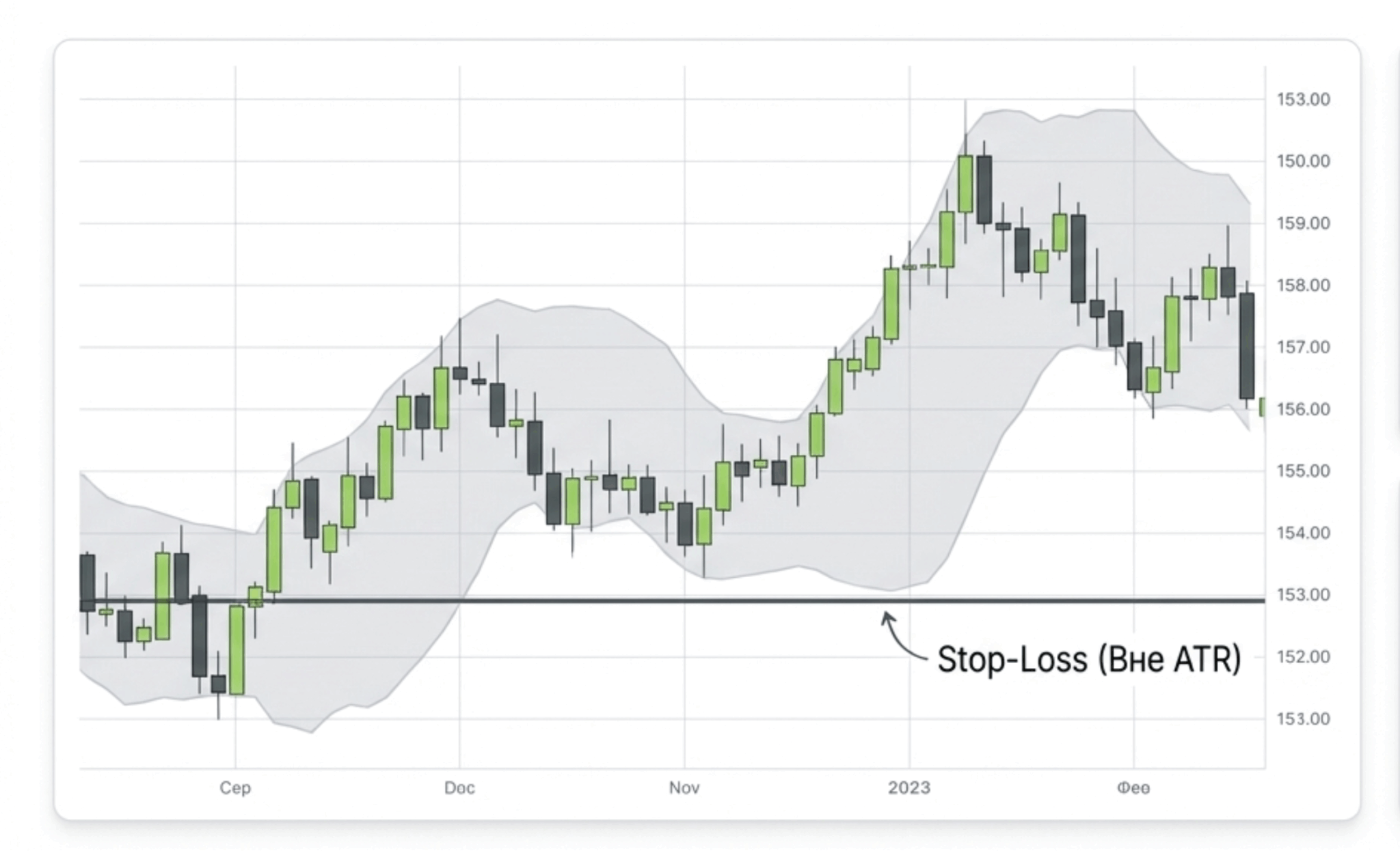 Логика ATR-стопа: если актив в среднем двигается на $15 в день (ATR = 15), то стоп-лосс на расстоянии $5 от входа будет выбит обычными дневными колебаниями, никак не связанными с вашим сценарием. Правильный стоп должен стоять за пределами «рыночного шума» — то есть дальше, чем ATR.