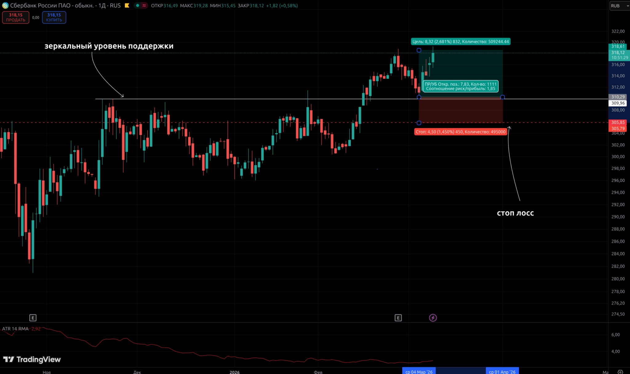 Проверяем: расстояние от входа (310,29) до стопа (305,79) = 4,50 рубля. ATR(14) = 2,92 рубля. Отношение: 4,50 ÷ 2,92 = 1,54× ATR. Это выше порога 1,5× ATR — значит, стоп расположен за пределами обычного рыночного шума и с высокой вероятностью не будет задет случайным колебанием цены.
