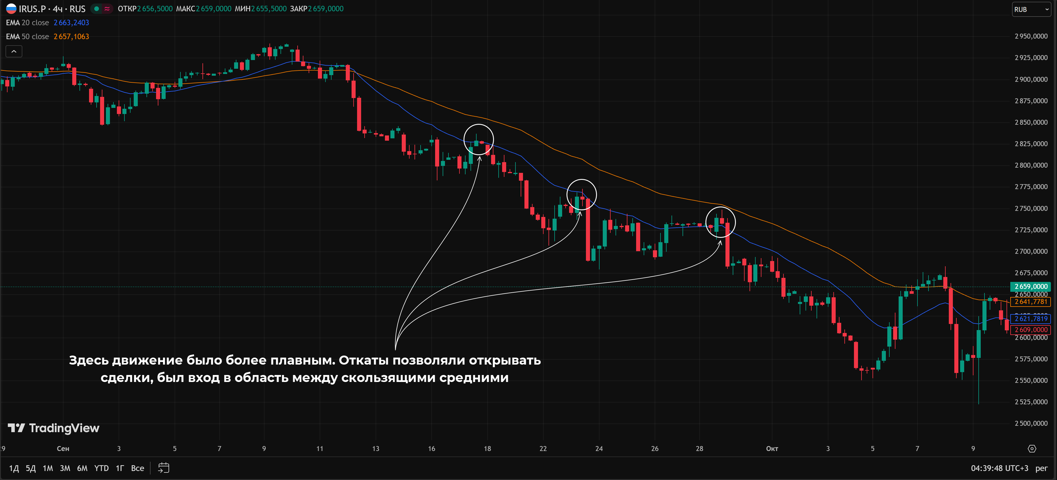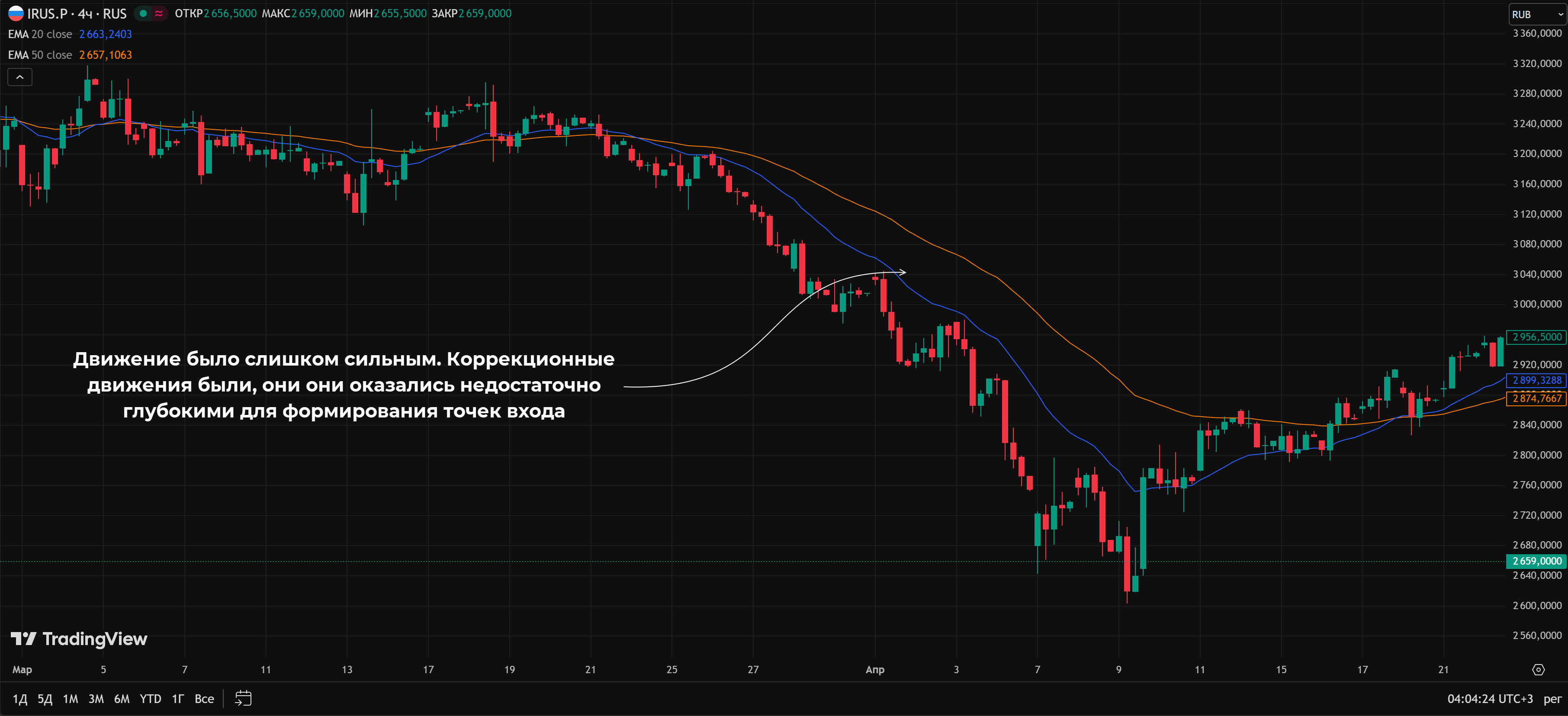 - Стратегия на скользящих средних. У ТС нет красивого названия, а в работе используются ЕМА с периодами 20 и 50 (таймфреймы Н4 и D1). Положение линий ЕМА указывает на направление торговли, точки входа ищутся в области между мувингами. На окончание коррекции может указать осциллятор, свечные паттерны, можно использовать и ретест пробитого ранее уровня. ТС не работает во флете, на сильных движениях дает мало точек входа так как глубина коррекций может быть недостаточной для входа в область между EMA 20 и 50.