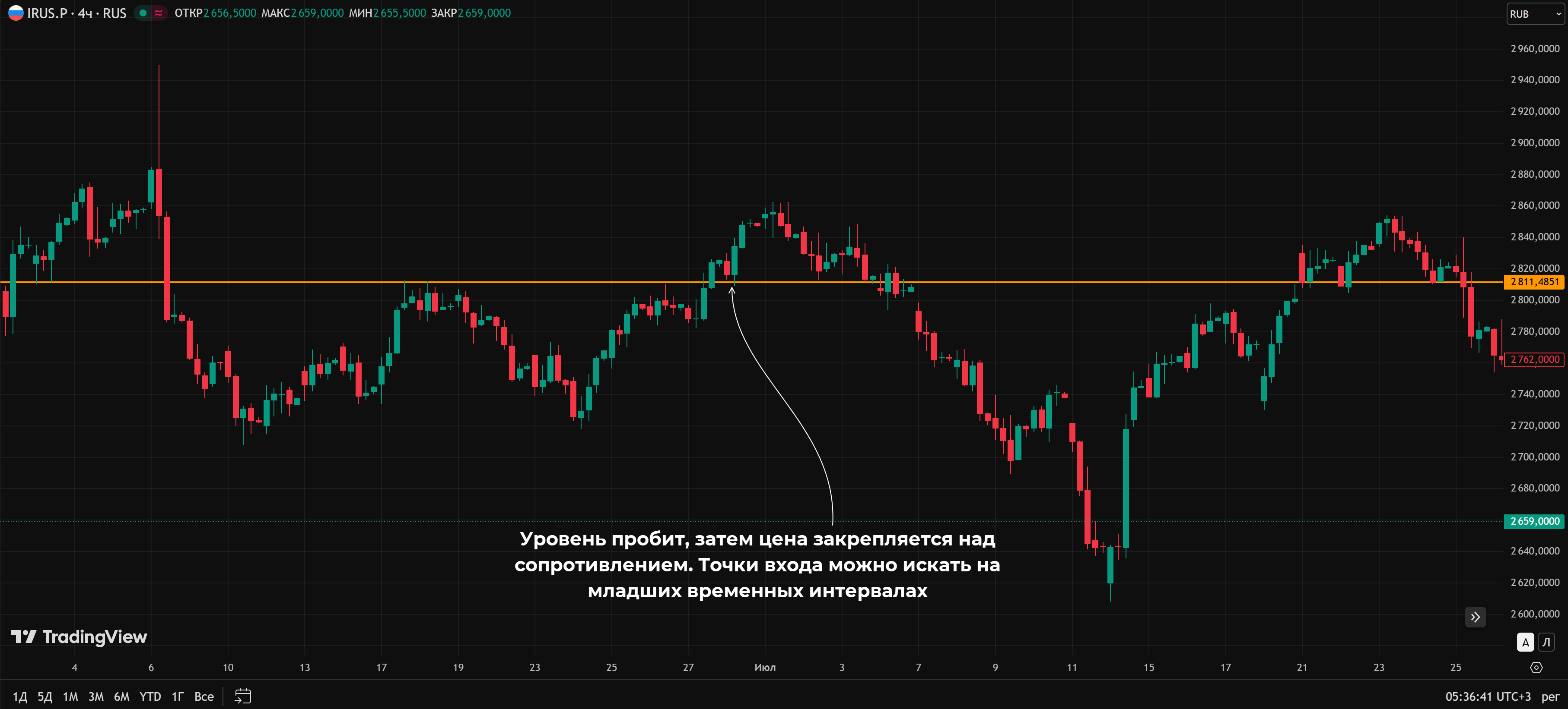 - Ложный пробой. Сценарий, в котором график делает заброс за уровень, но пробой не подтверждается и начинается движение в противоположном направлении. Истинность пробоя можно оценить с помощью объемов и движения самого графика. При ложном пробое после заброса за уровень происходит быстрый возврат под него, если происходит попытка закрепиться за поддержкой/сопротивлением, то это происходит на низких объемах.