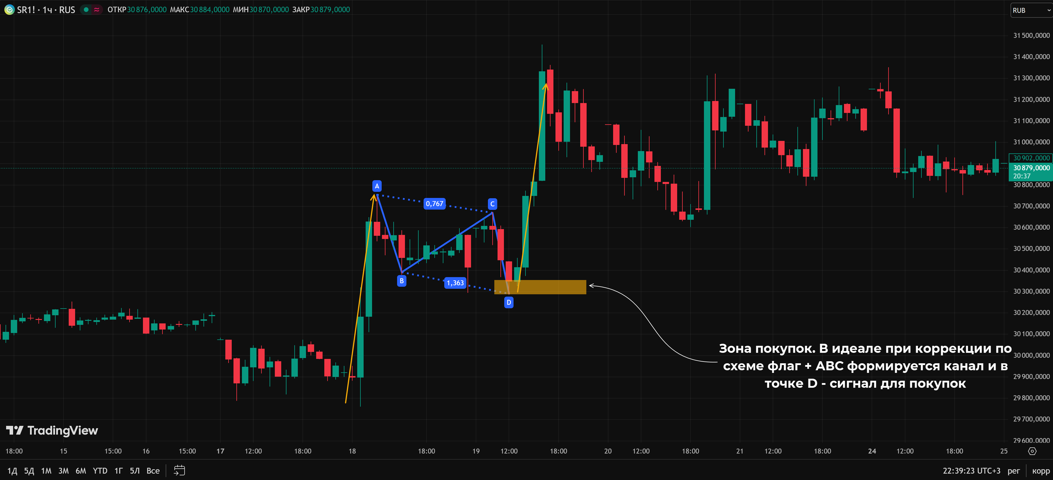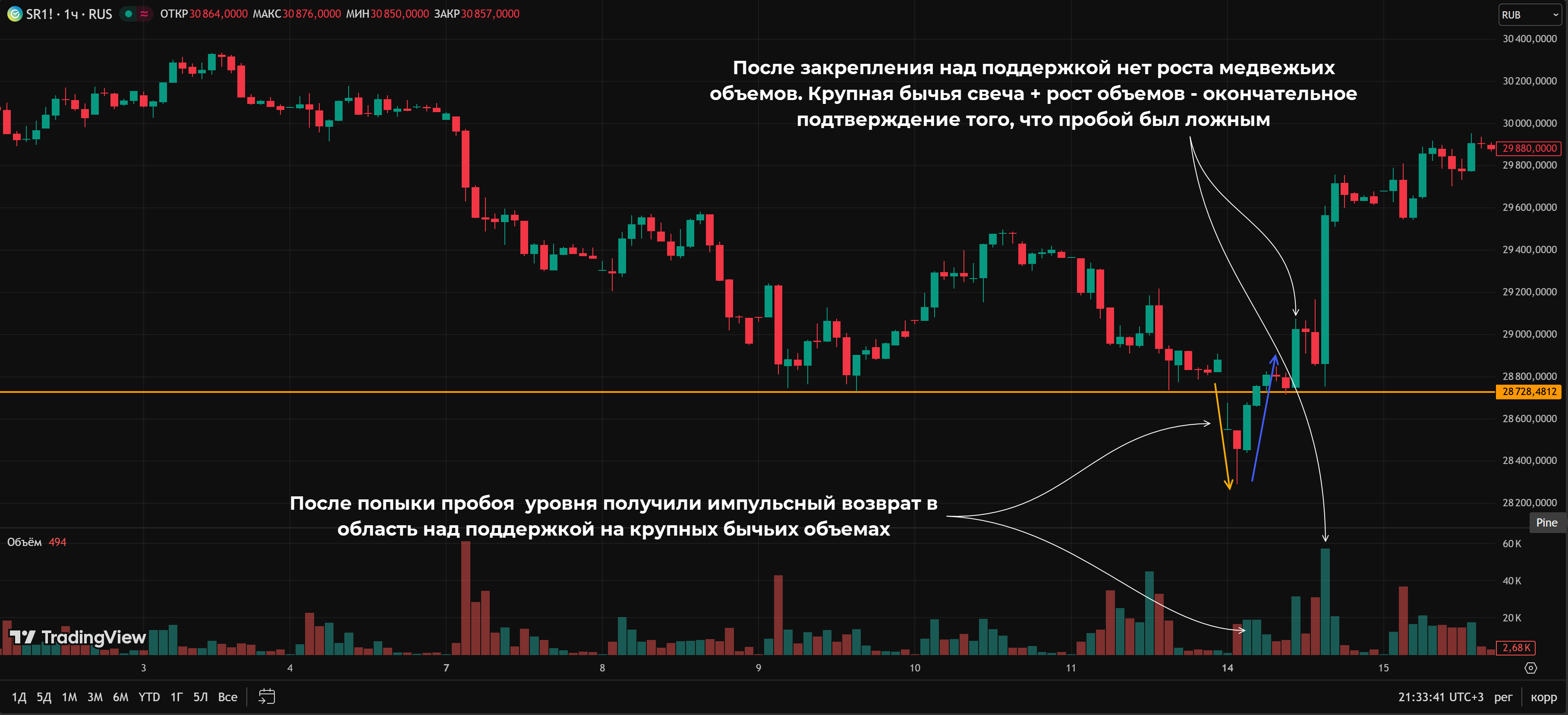 В примере ниже можно было купить фьючерс на акции Роснефти после неспособности обновить локальный минимум. При этом была опора на давний зеркальный уровень. В момент покупки один контракт оценивался в 40153 рубля, при фиксации профита его стоимость выросла до 41394 рублей, прибыль трейдера составит 41394 – 40153 = 1241 рубль.
