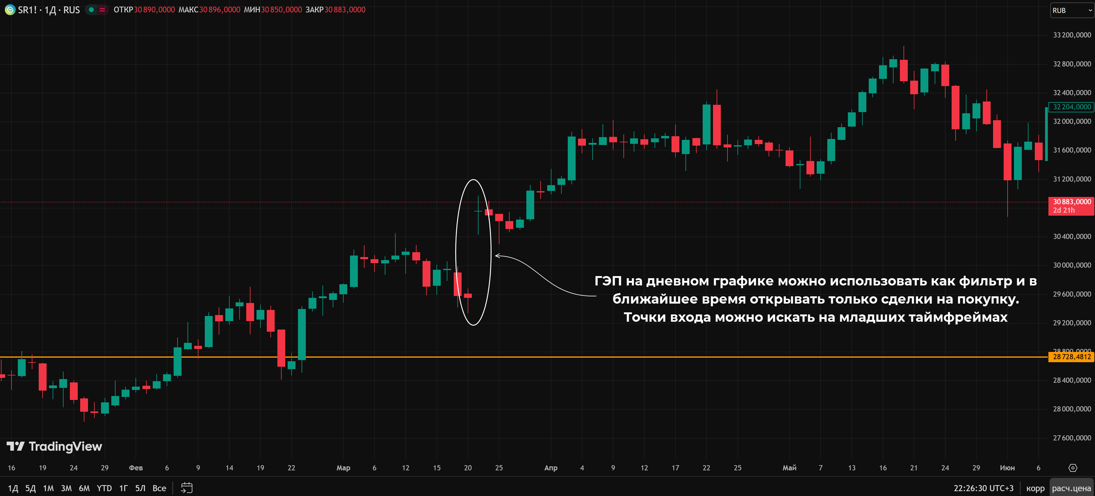 - Торговля на ГЭПах. Разрывы на графике работают и в контексте фьючерсов. ГЭП часто задает направление движения в ближайшем будущем, также разрыв на графике имеет свойство рано или поздно закрываться. В торговле используется оба свойства, но самого ГЭПа недостаточно для торговли, понадобятся дополнительные условия. Также разрыв можно использовать как фильтр для определения приоритетного направления торговли.