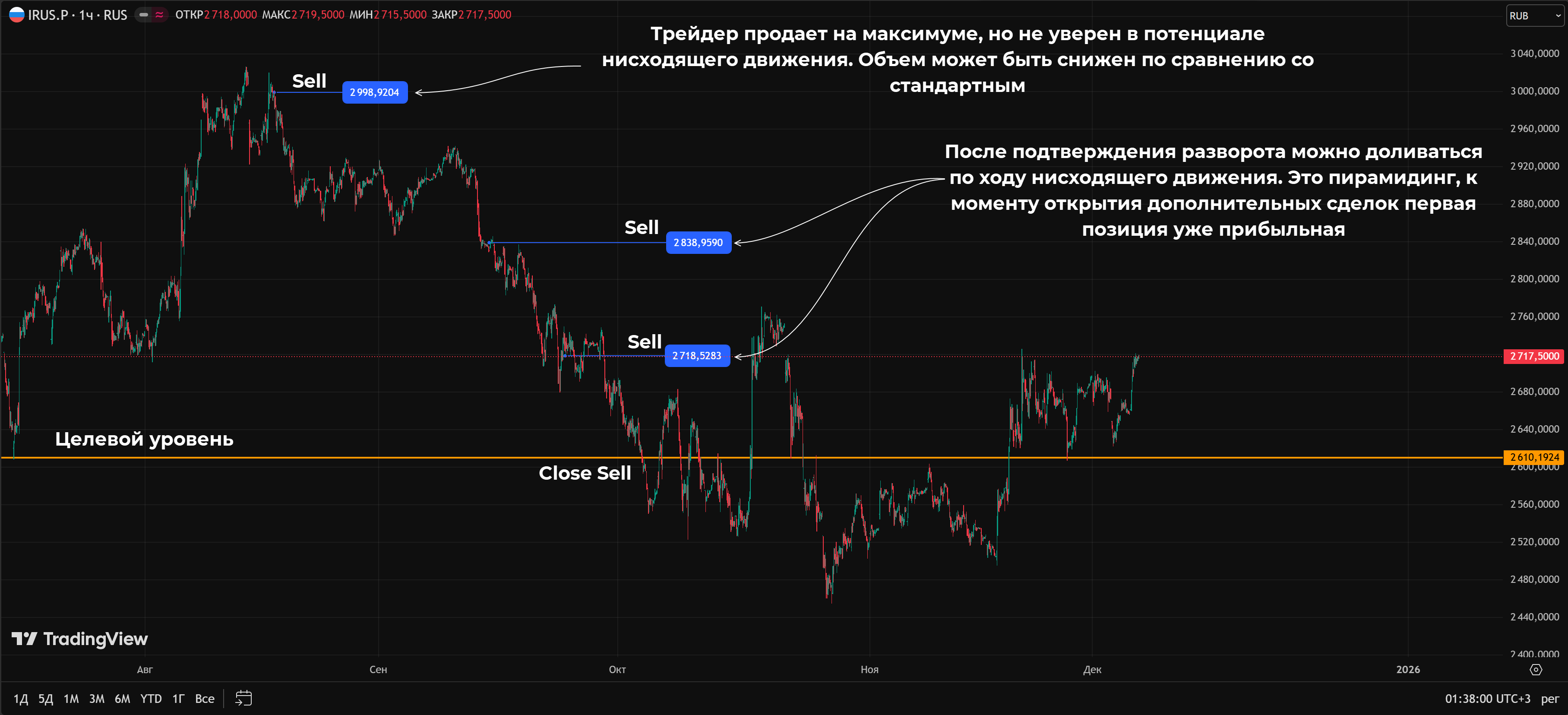 Управление уже открытой позицией не сводится к выбору момента для выхода из рынка. Трейдер может фиксировать прибыль частями, доливаться по ходу движения, если оно оказалось особо сильным.