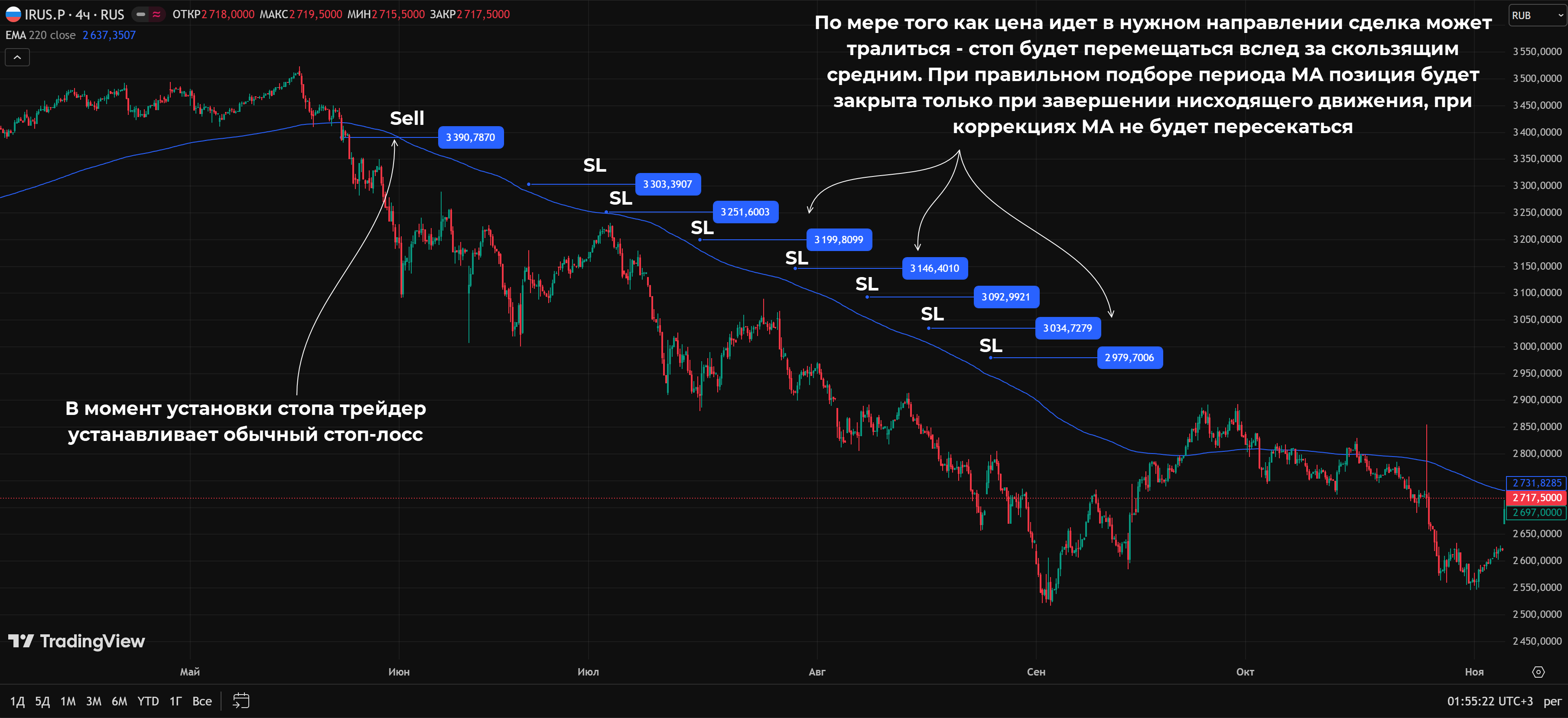 - Трал сделки. Трейлинг-стоп означает перемещение стопа вслед за ценой на определенном расстоянии. Трал может быть фиксированным или выполняться по индикатору. Часто используется трейлинг-стоп по скользящим средним, Параболику. Цель этого приема – защитить часть прибыли на случай, если график не доберется до целевого уровня, а трейдер не сможет зафиксировать профит вручную.