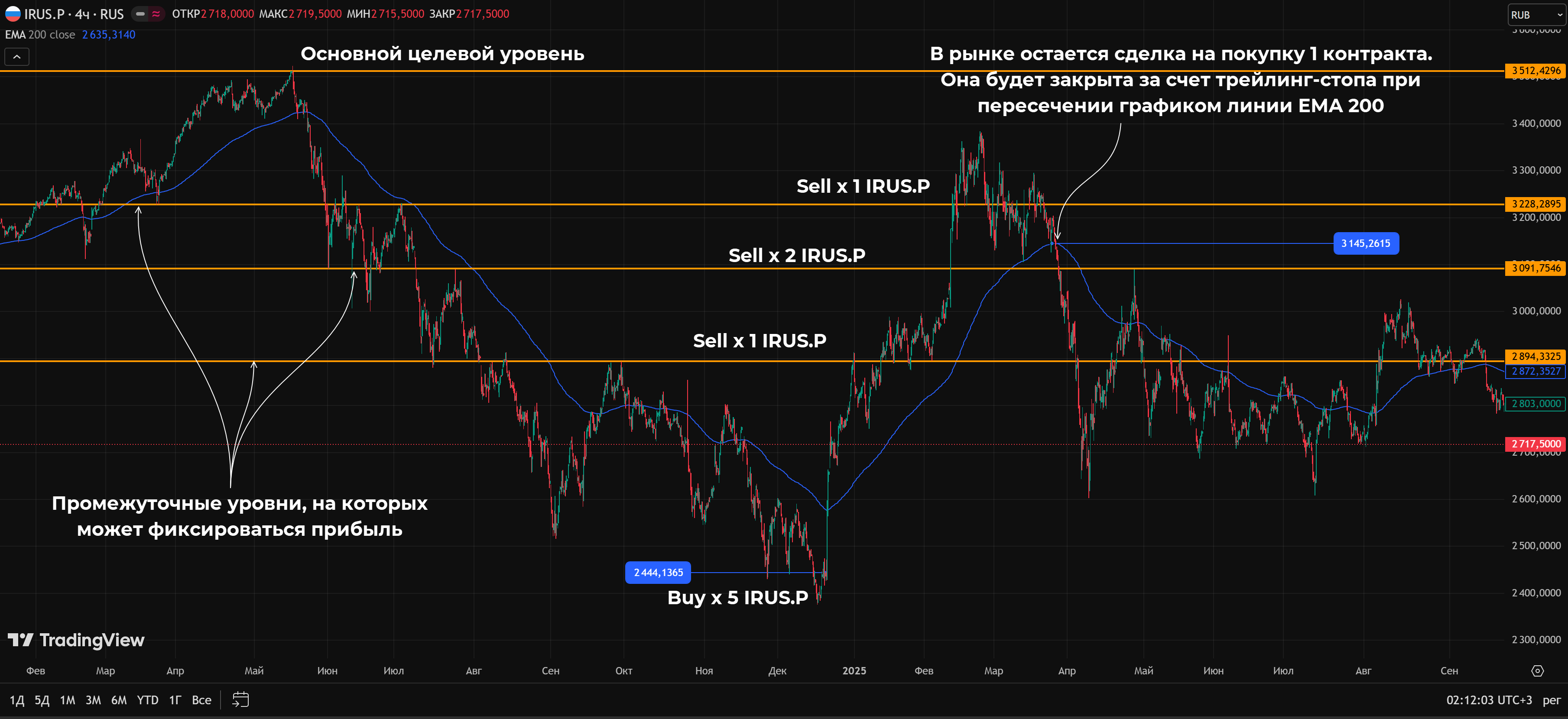 - Частичная фиксация прибыли. Необязательно закрывать весь объем досрочно, можно делать это частями. Если есть несколько целевых уровней, то на них можно закрывать, например, по 25-30% от объема. Представьте, что трейдер купил 5 фьючерсов на индекс Мосбиржи (этот контракт автоматически пролонгируется), он выделил 1 основной и 3 промежуточных целевых уровня. При достижении каждого из уровней можно продавать 1-2 контракта с той же экспирацией, когда 3 промежуточные цели будут достигнуты остаток можно тралить для дополнительной страховки.