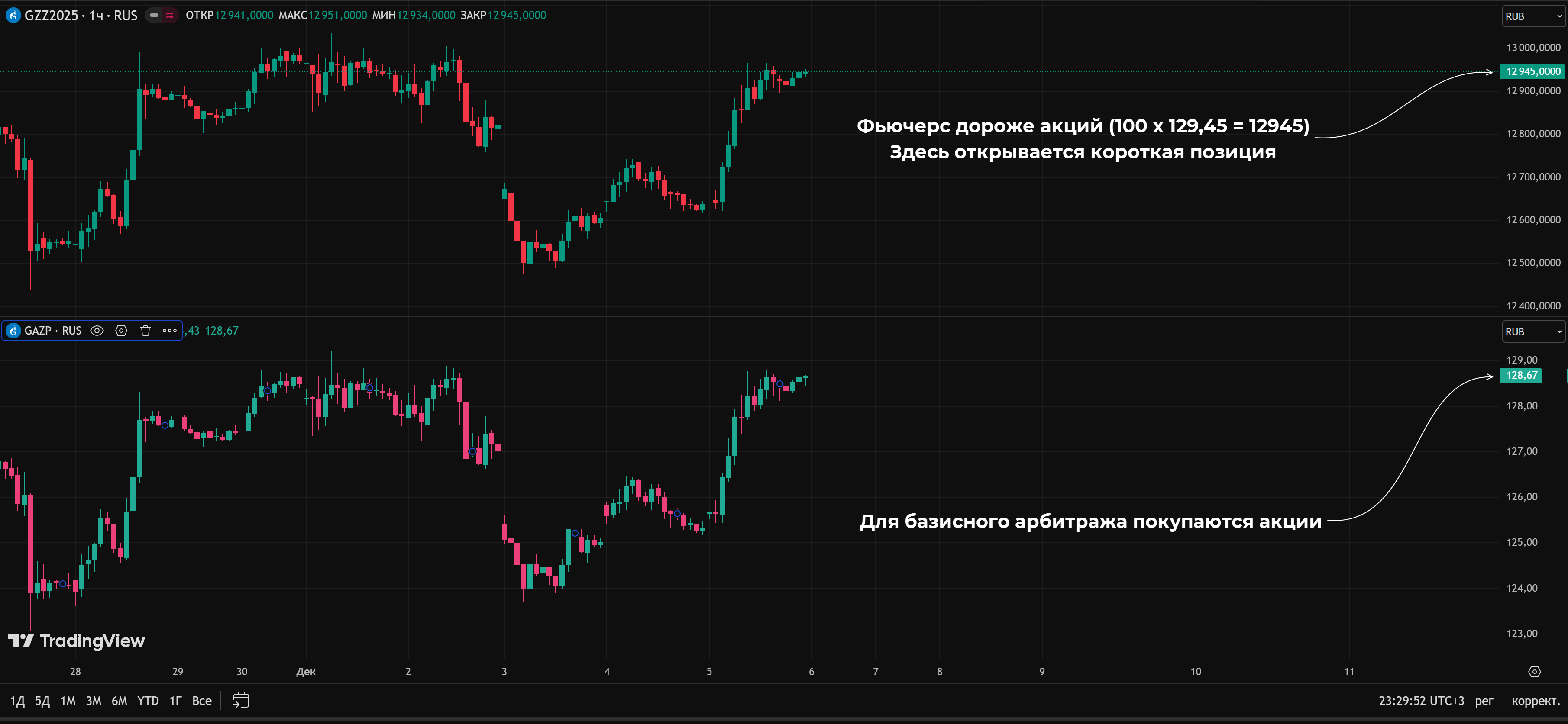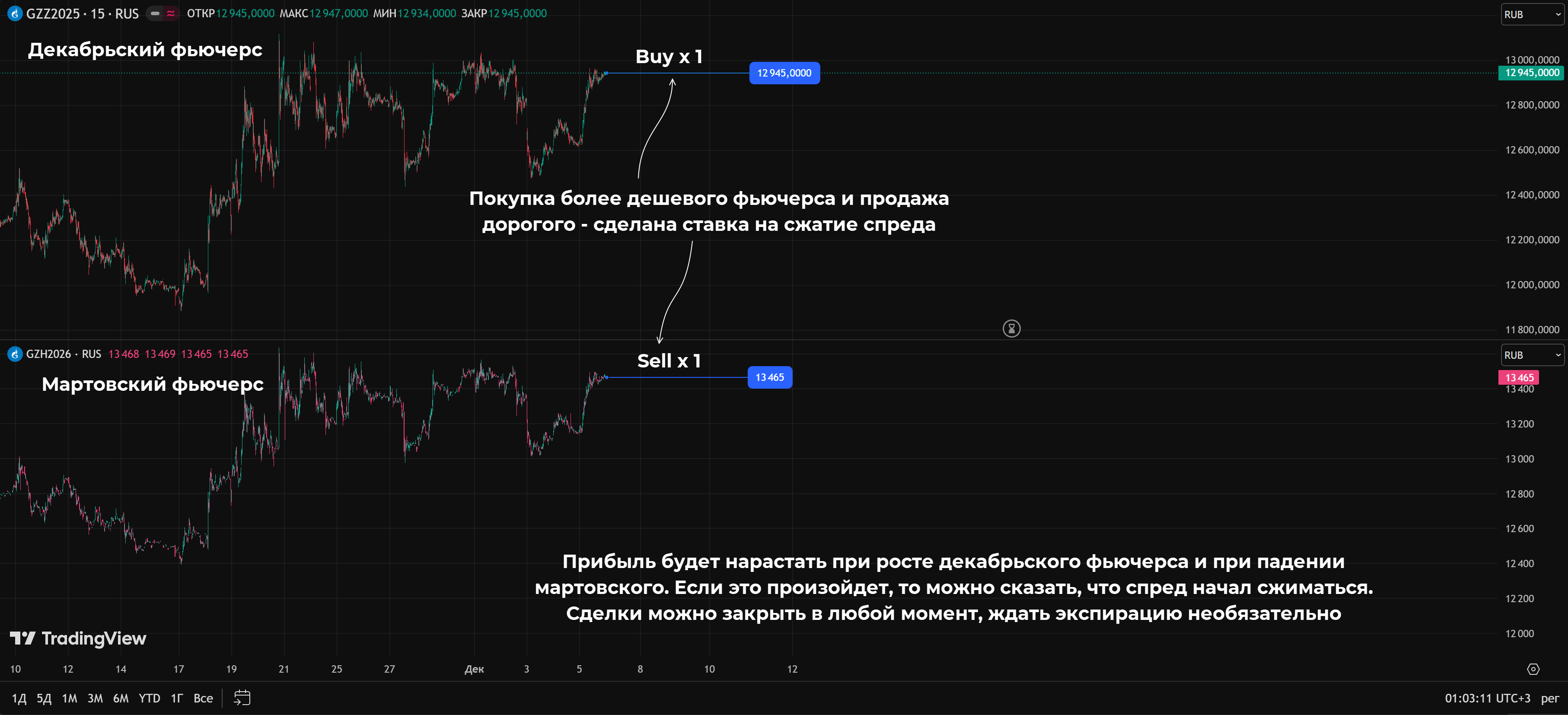 Календарный фьючерсный спред. Декабрьский фьючерс на бумаги Газпрома стоит 12945 рублей, мартовский – 13465, можно сделать ставку на сужение спреда. Для этого нужно купить один или несколько контрактов с ближней экспирацией и продать такой же объем мартовских фьючерсов. Представьте, что в какой-то момент времени декабрьский контракт вырос до 13500 рублей, мартовский вырос до 13700. При таком сценарии, если закрыть обе позиции, то трейдер получит +555 рублей по контракту с ближней экспирацией и -135 рублей по мартовскому, итоговый результат составит +320 рублей.