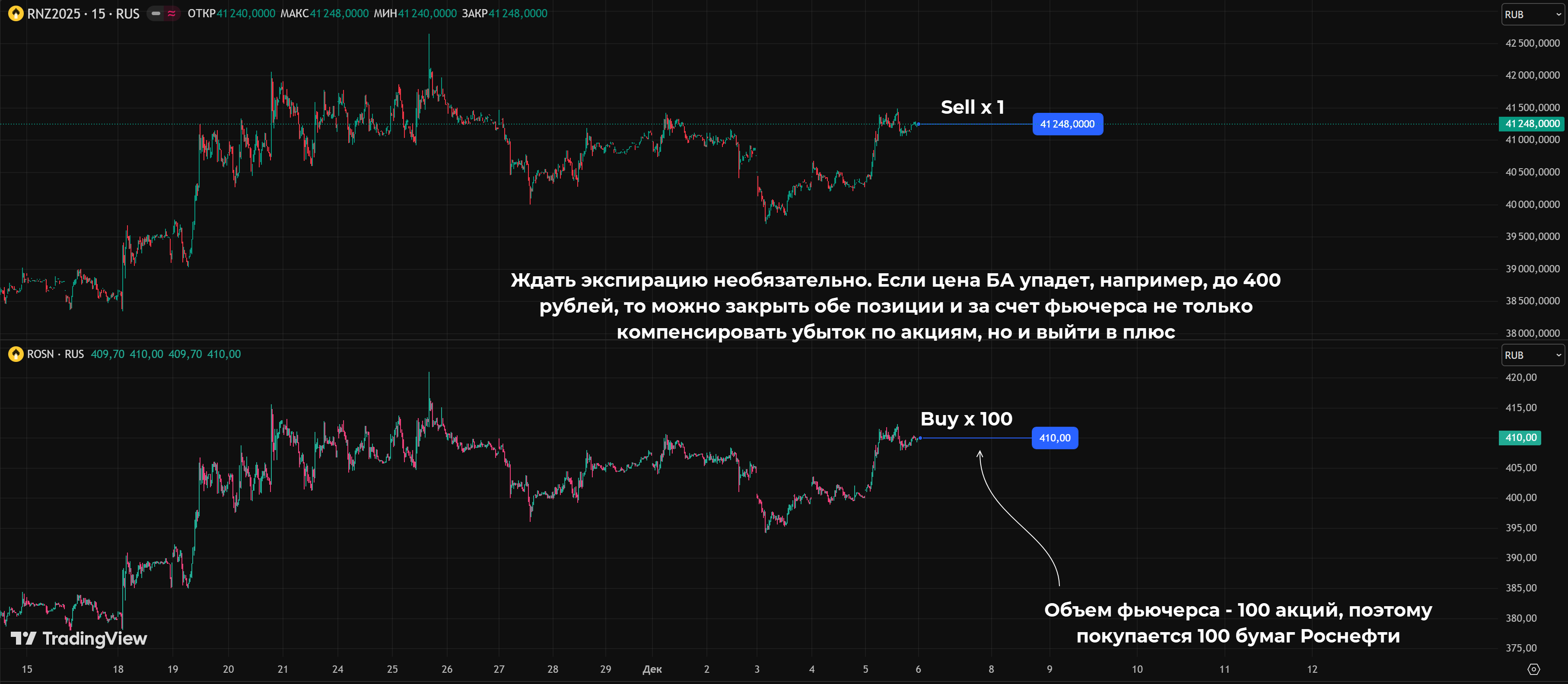Продан фьючерс на акции Роснефти (41248 рублей, размер – 100 акций), открыта длинная позиция по бумагам Роснефти – куплено 100 акций по 410 рублей за штуку. Предположим, цена упала до 400 рублей, трейдер решил не дожидаться экспирации и закрыл позиции. Он получил убыток в 1000 рублей за счет лонга по БА и +1248 рублей за счет фьючерса, в итоге прибыль составила 248 рублей.