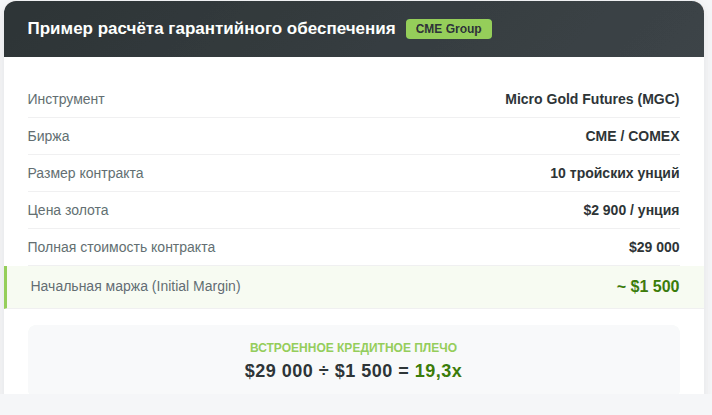 При цене золота $2 900 за унцию полная стоимость контракта составляет $29 000. Но за счет встроенного плеча гарантийное обеспечение (зависит от биржи и брокера) составит примерно $1 500. В этом примере плечо составит 29 000/1 500 = 19,3 или 1 к 19,3, для заключения сделки нужно почти в 20 раз меньше средств по сравнению со стоимостью базового актива.