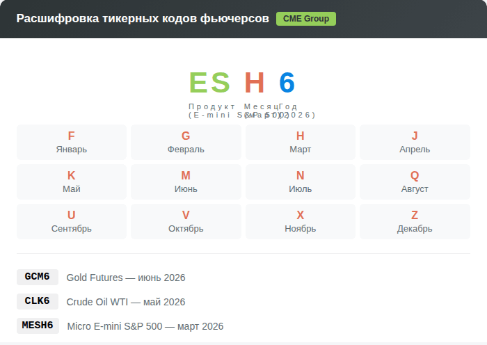 Спецификация зависит от конкретной биржи. Правила именования контрактов на CME Group отличаются от методик, например, на Eurex или ICE. Ниже — пример кодировки для CME: ESH6 расшифровывается как E-mini S&P 500 (ES), март (H), 2026 год (6). Месяцы экспирации обозначаются буквами: F — январь, G — февраль, H — март, J — апрель, K — май, M — июнь, N — июль, Q — август, U — сентябрь, V — октябрь, X — ноябрь, Z — декабрь.