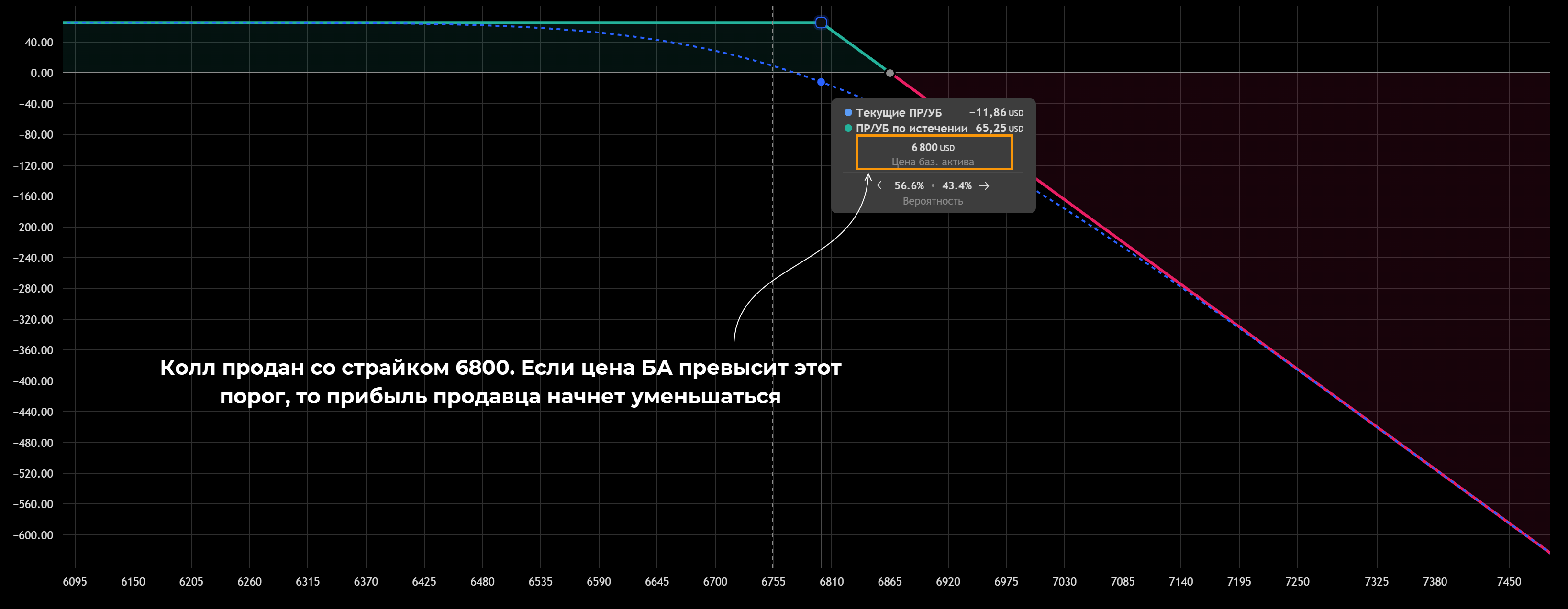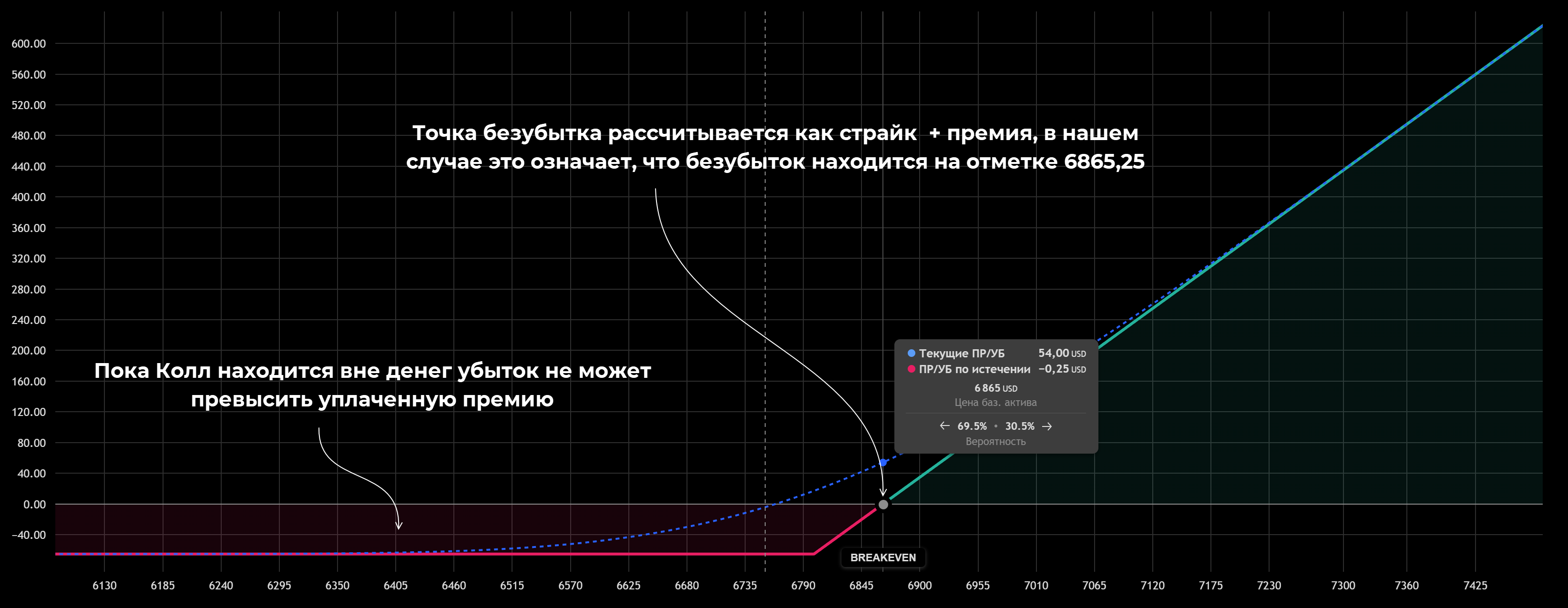 В примере ниже Колл куплен за $65,25, страйк – 6800, цена БА в момент входа в рынок составила 6765 (Call OTM). С учетом этого точка безубытка находится на отметке 6800 + 65,25 = 6865,25. Здесь трейдер выйдет в ноль, а при дальнейшем росте стоимости базового актива начнет зарабатывать.