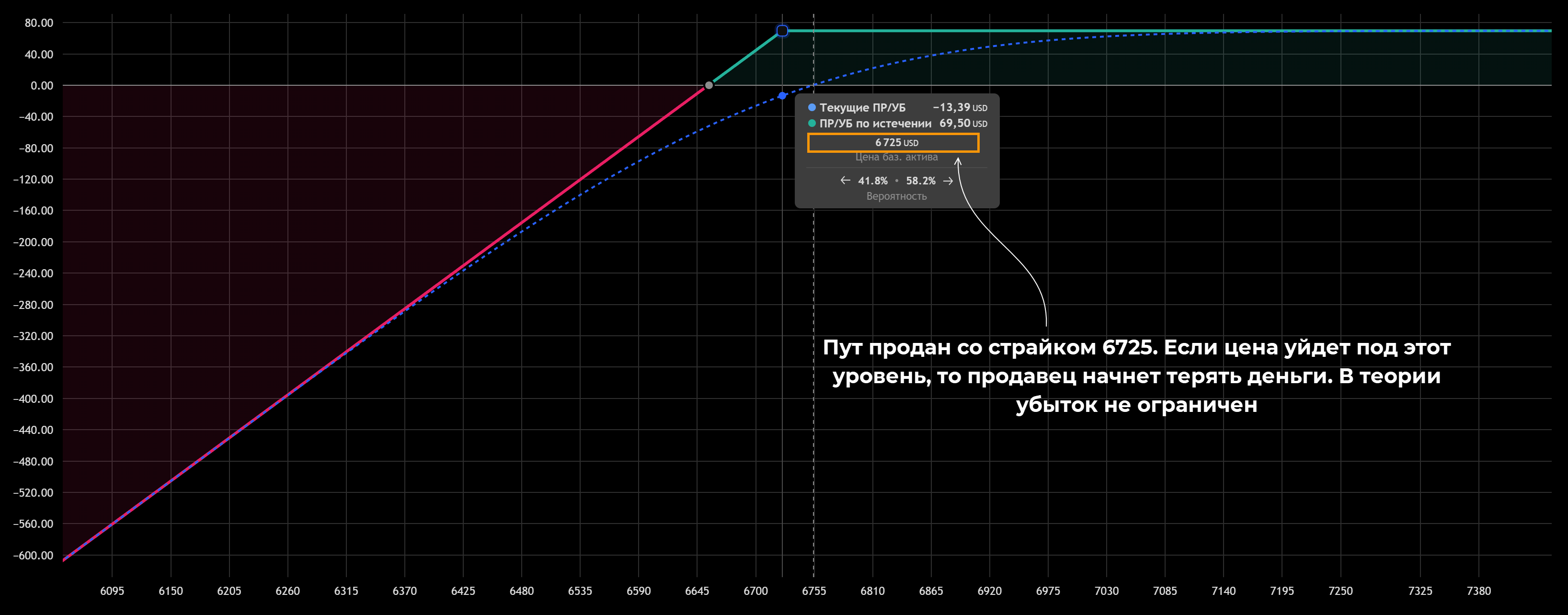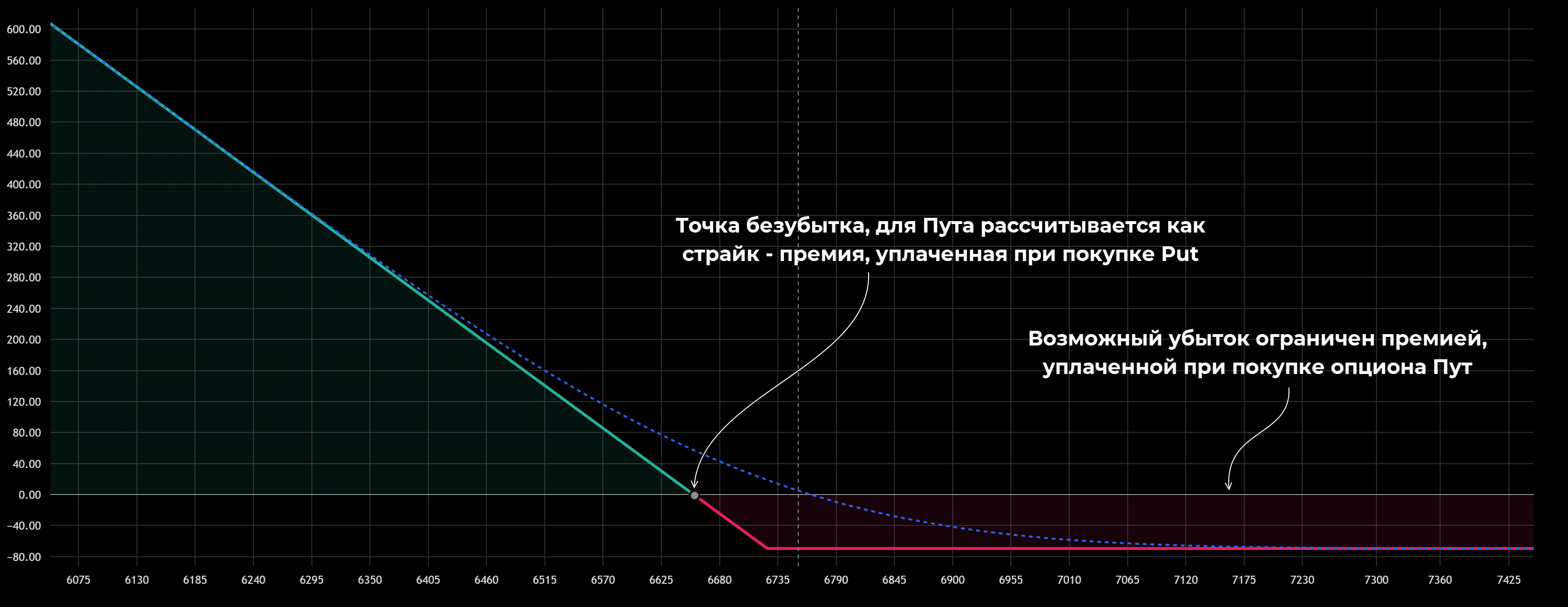 С учетом этого цена должна опуститься ниже страйка на 69,50, чтобы трейдер вышел в ноль. Если котировки базового актива продолжат снижаться, то начнет расти прибыль. Как и в случае с Коллом возможные потери ограничены премией. Безубыток находится на отметке 6725 – 69,50 = 6655,50.