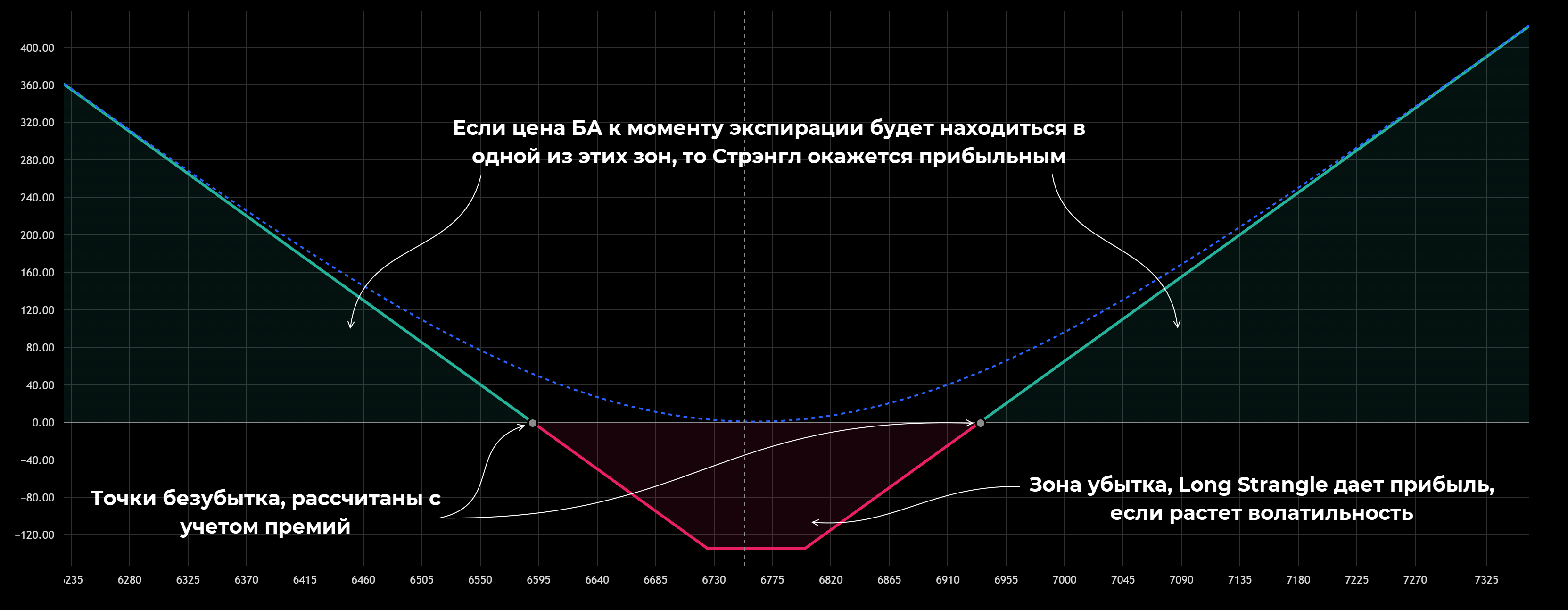 Диаграмма точек безубыточности длинного стрэнгла с зонами прибыли и убытков