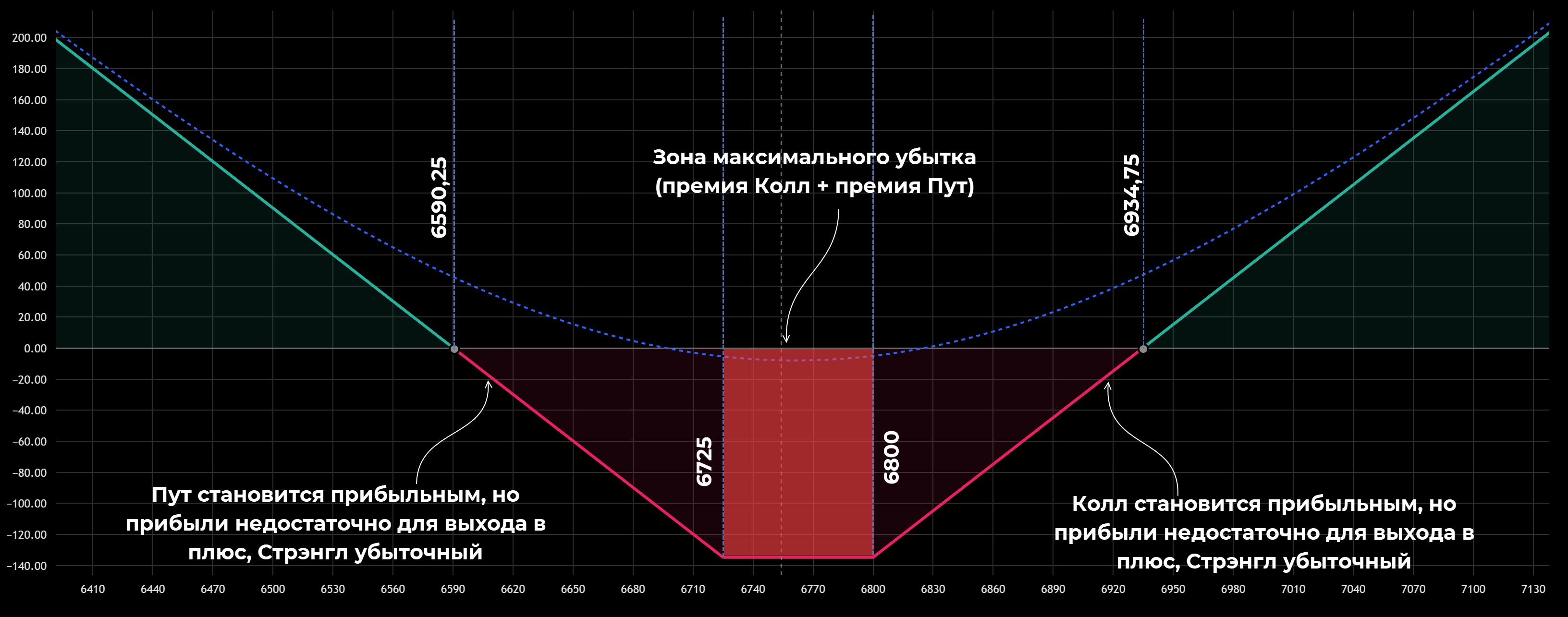 • Диапазон 6725-6800 – максимальный убыток, покупатель опционов теряет 134,75. Диапазоны 6590,25-6725 и 6800-6934,75 также соответствуют убыткам, но за счет роста волатильности потери будут меньше. Рост волатильности позволяет заработать на одном из опционов, но этого роста недостаточно для компенсации премий по обоим опционам.