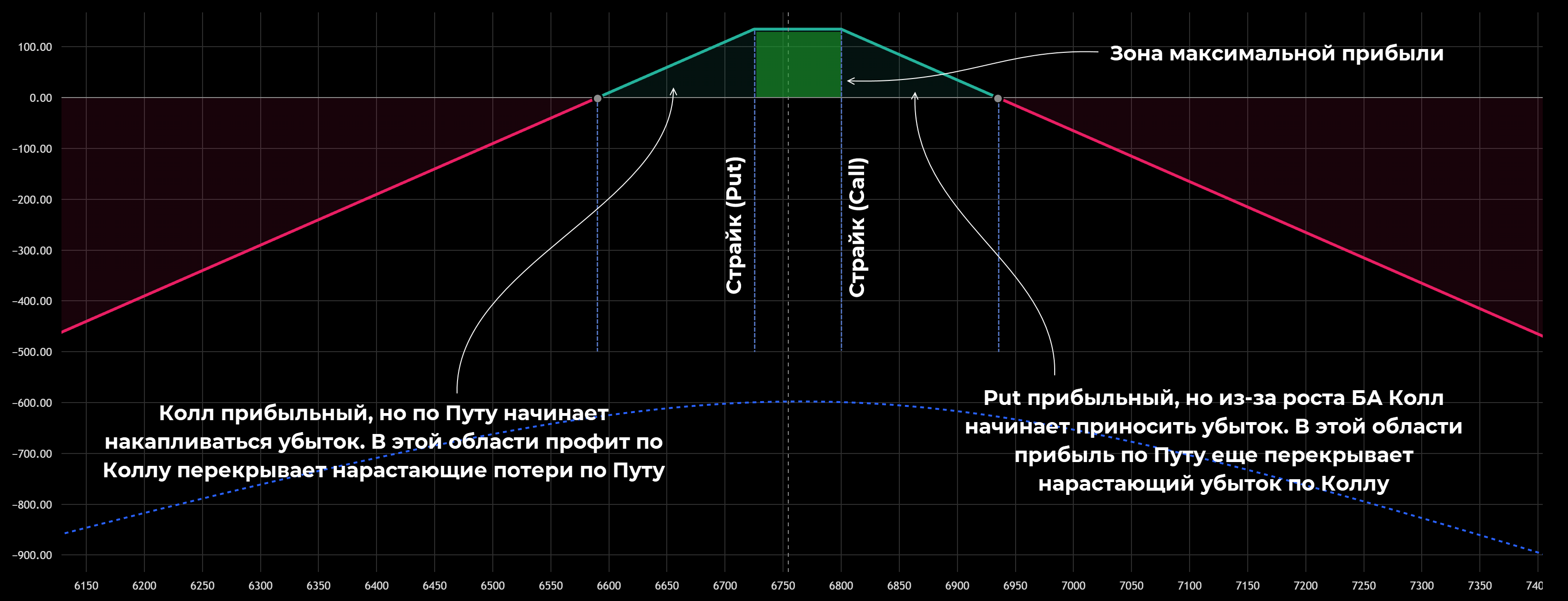 Главное отличие от Стрэддла заключается в том, что на линии, отображающей возможную прибыль, появляется плато. Оно возникает из-за того, что страйк цена опционов отличается.